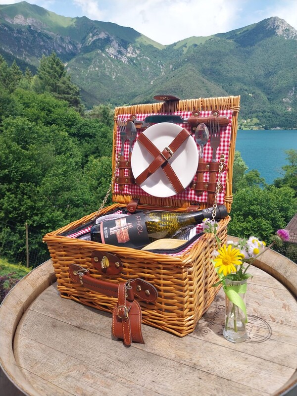 A tasty picnic in the middle of the meadow, surrounded by the rows of the vineyard on the shores of Lake Ledro.