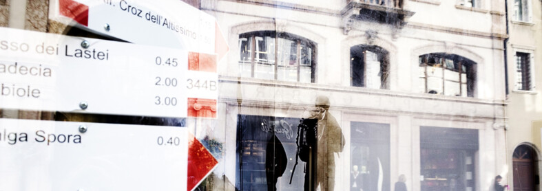 La via prosegue lasciando aperti piccoli varchi verso destra e verso sinistra, che conducono a vicoli che sembrano invitarti a scoprire piccole botteghe e vetrine curate; ma noi ti chiediamo di proseguire dritto, fino a “el Canton”, ovvero il punto di incrocio con Via San Marco -che prosegue diritta sotto la torre di Castello del Buonconsiglio- e Via San Pietro, dove il nostro Giro al Sass proseguirà fra un attimo, subito dopo averti chiesto di dedicarti un attimo ad osservare quest’angolo, uno dei più fascinosi della città, incorniciato da palazzi sui quali si sovrastano loggette, balconcini, aperture a bifora, su più strati e su tutti i lati.