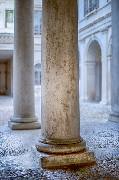 Riprendendo il passo, fra vetrine e locali, e superando l’entrata principale del Teatro Sociale della città, raggiungerai la fine della via. Prima di proseguire su Via Manci, che imboccherai svoltando a destra, soffermati un attimo e orienta il tuo sguardo verso sinistra. Incontrerai una facciata candida, elegante, dai lineamenti classici, con un portone di legno massiccio che si apre fra doppie colonne corinzie, sovrastato da un piccolo balconicino che arricchisce il prospetto.