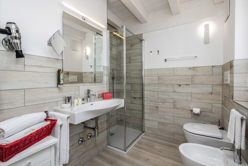 bidet, doccia, acqua corrente c/f, WC, lavabo, kit cortesia