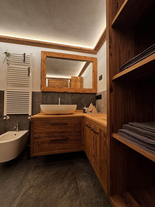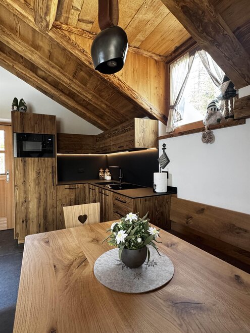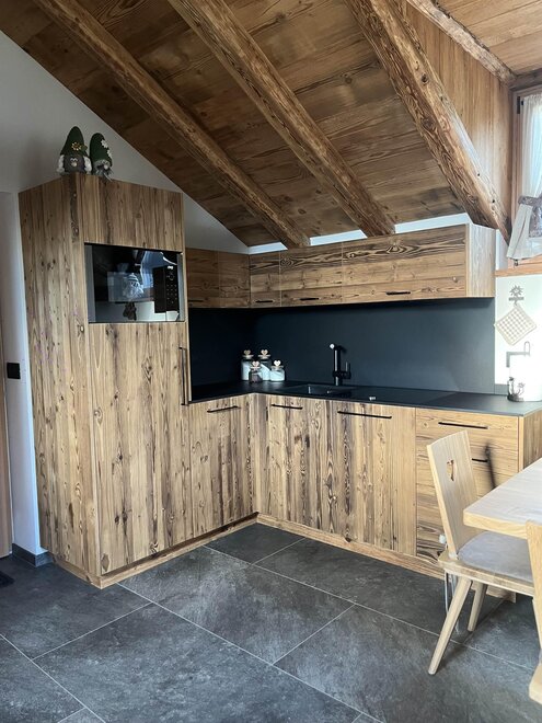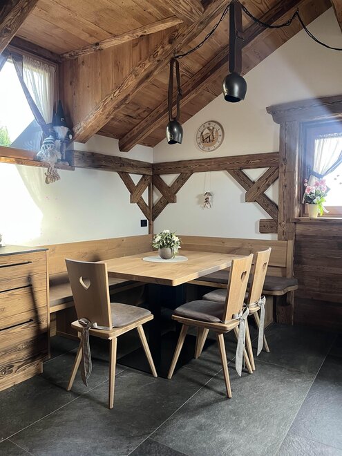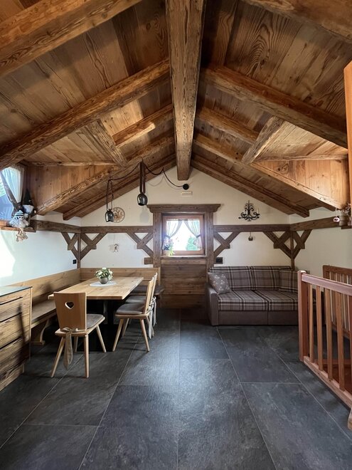Una scala in legno di larice vi porterà al piano superiore dove troverete un'area open space con cucina completamente attrezzata, (forno a microonde- piano ad induzione con le pentole adatte) Lavastoviglie frigo - piccolo freezer. Piatti e stoviglie Mini pimer Moka Tovagliette per la colazione e tovaglia un tavolo di legno di rovere con giro panca e sedie e un comodo divano. L’intera baita è riscaldata con un sistema di riscaldamento a pavimento. La baita non è raggiungibile con la propria auto.