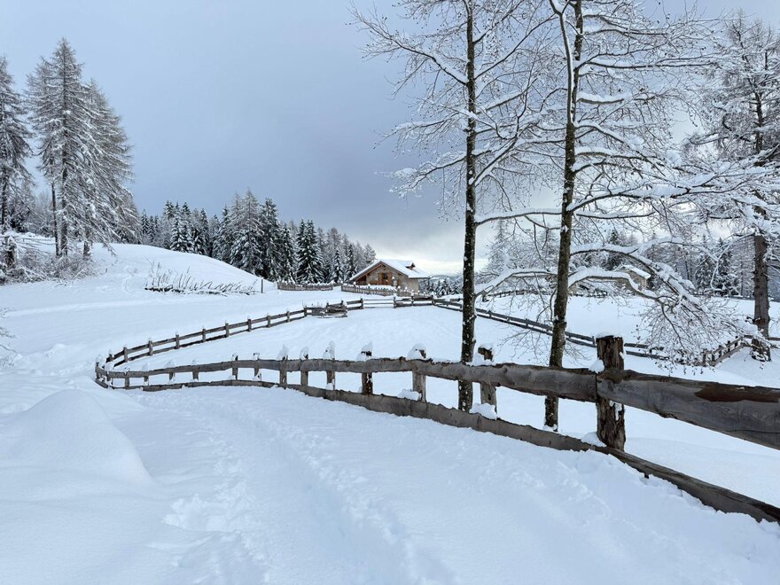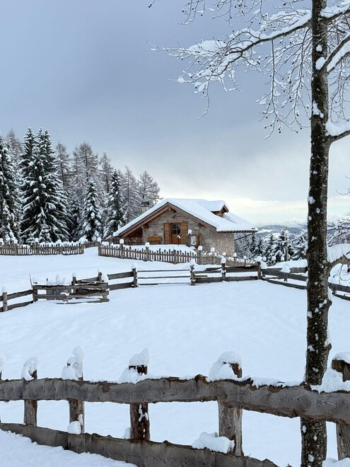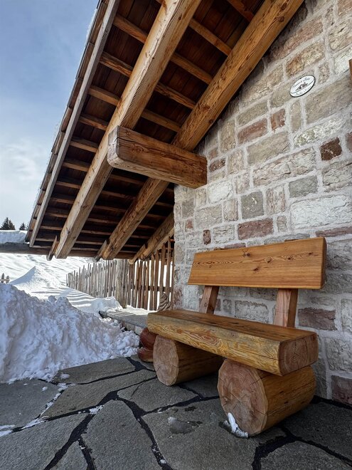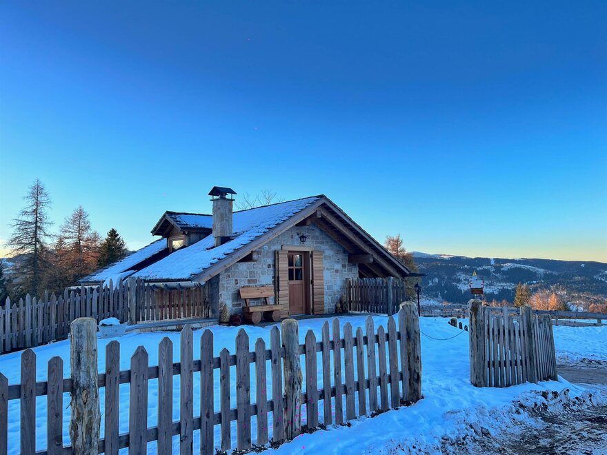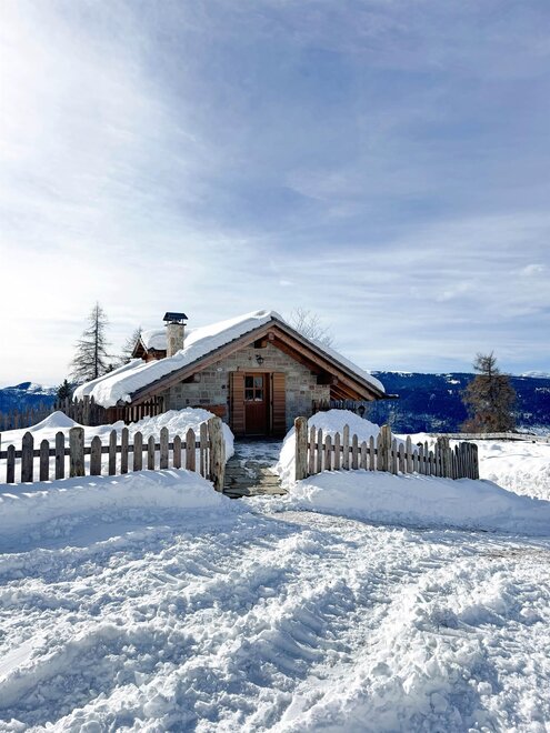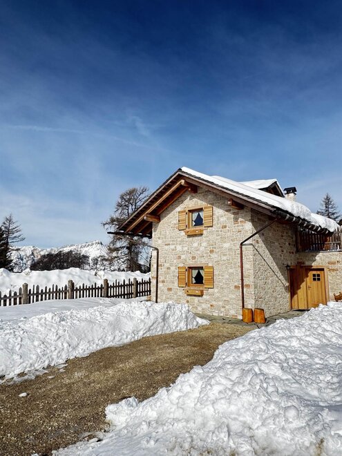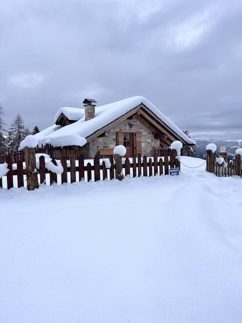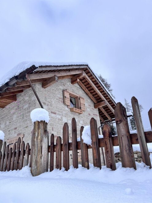 Durante l'inverno, la baita si trasforma in un rifugio incantato. Coperta da un manto di neve sofficie, è l'ideale per chi cerca relax e avventura.