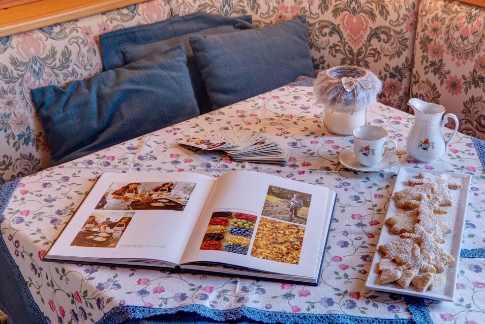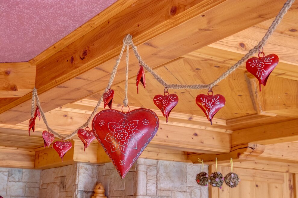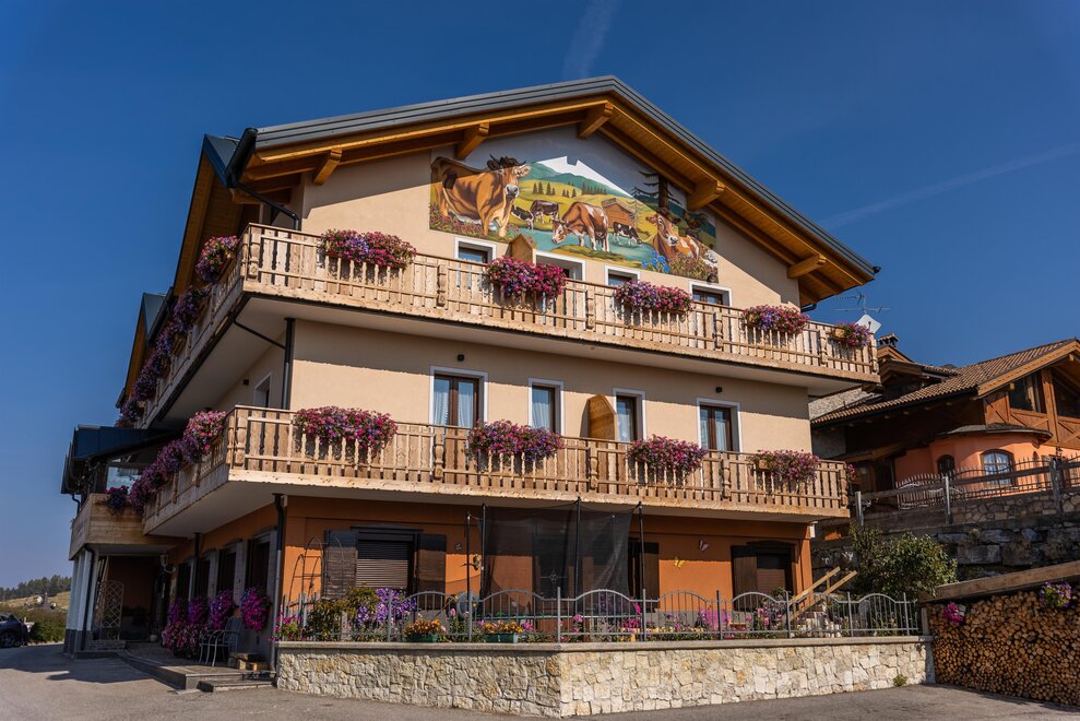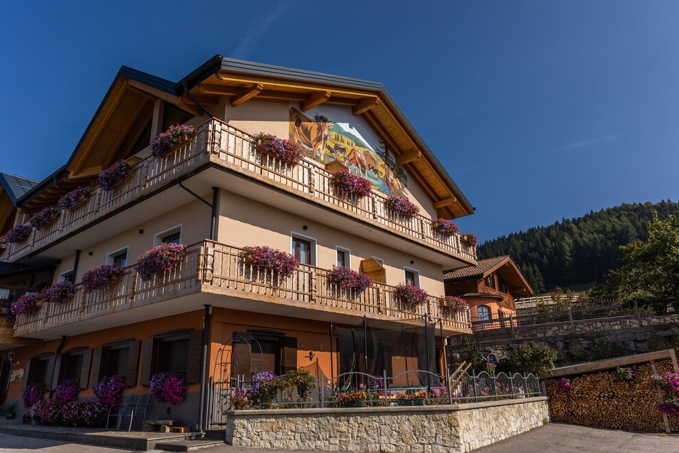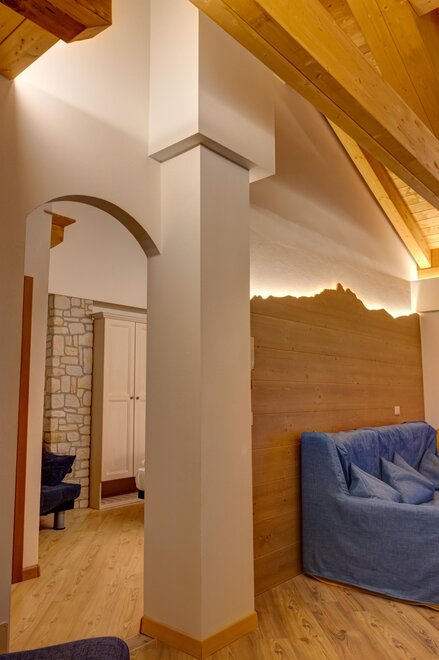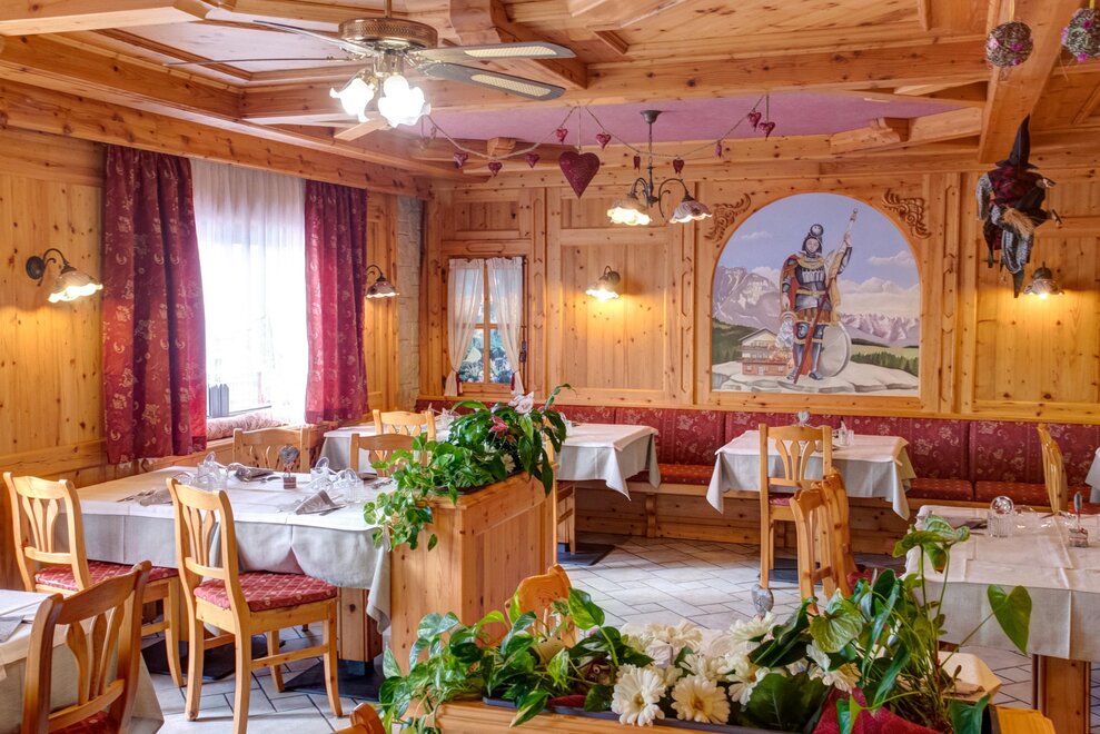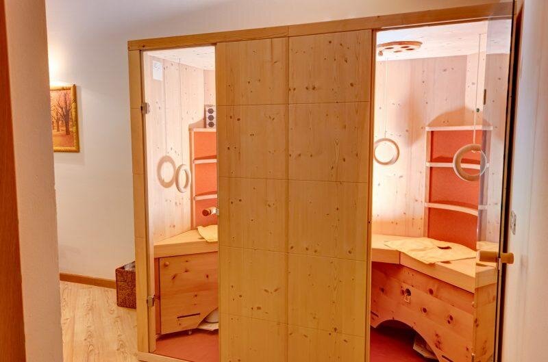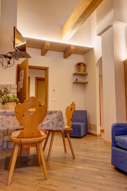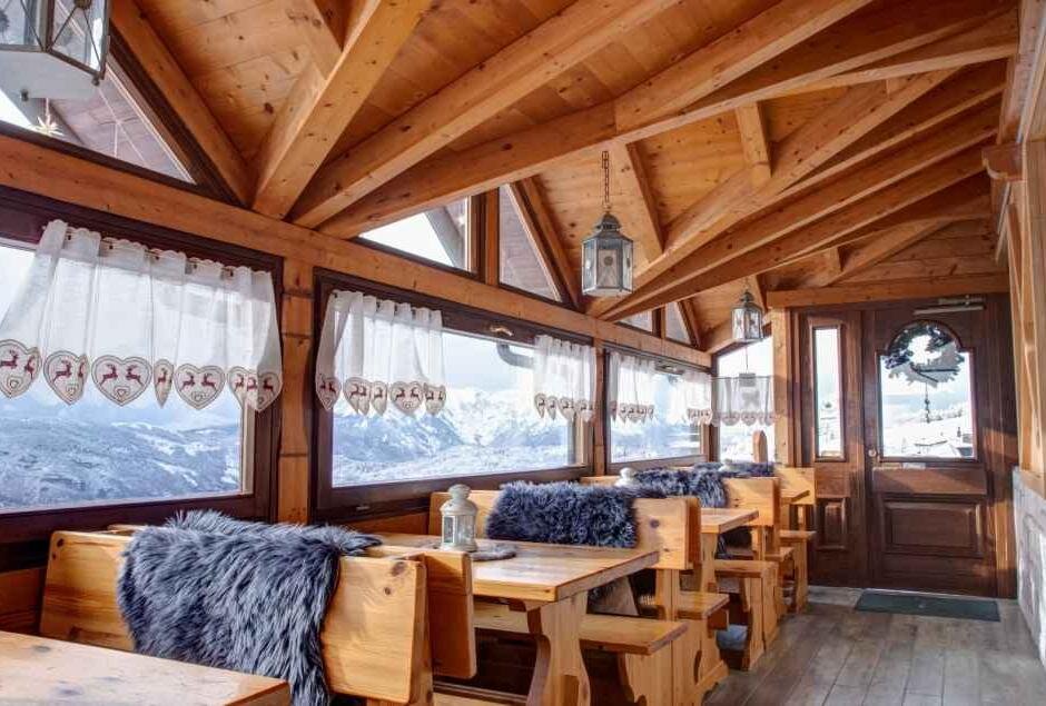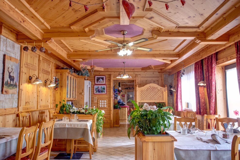 Arredata con legno di cirmolo invecchiato e profumato. Rivolta a Valle si affaccia sul borgo e sulle montagne, da qui si può ammirare uno splendido tramonto.