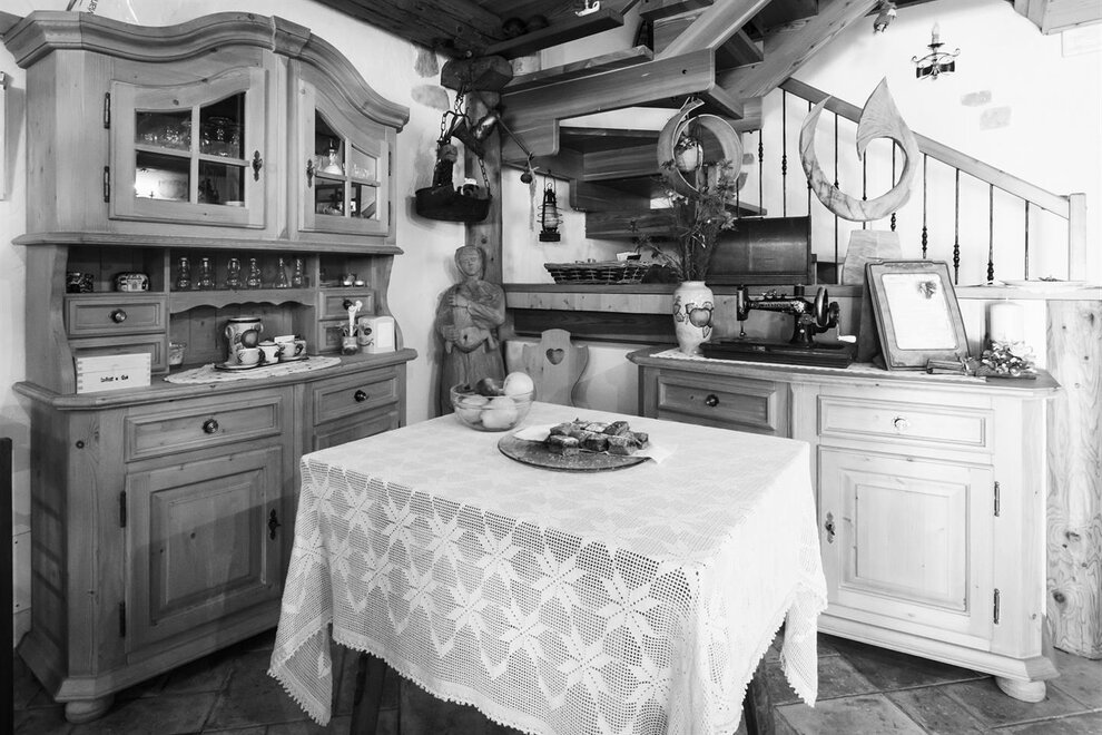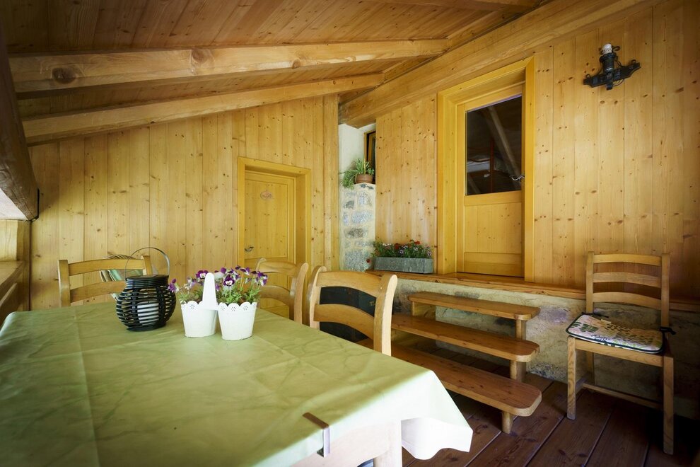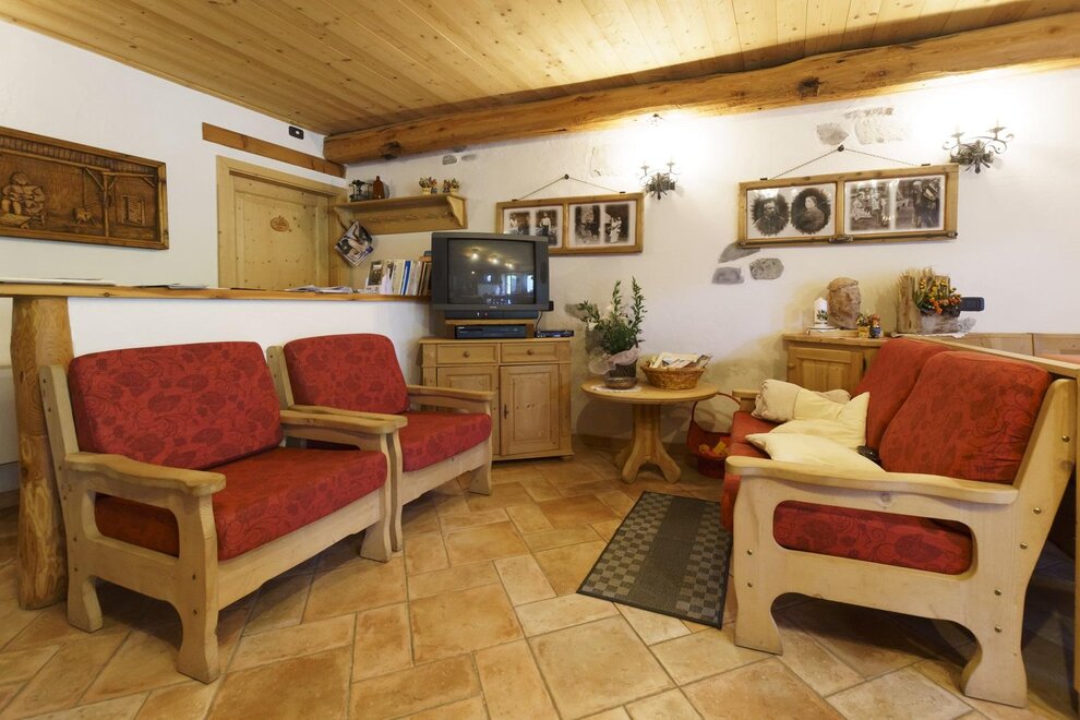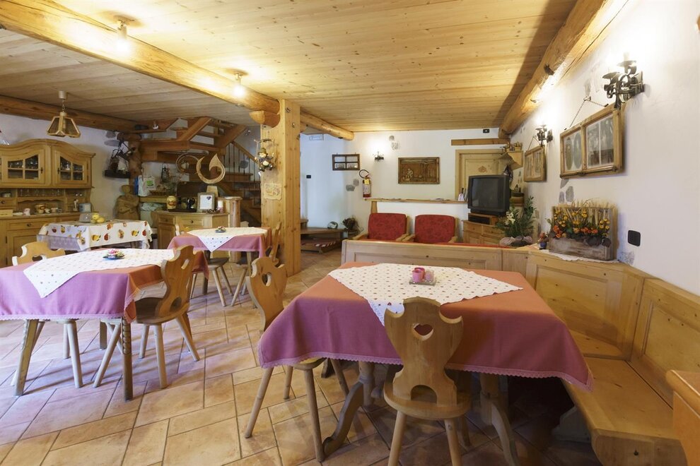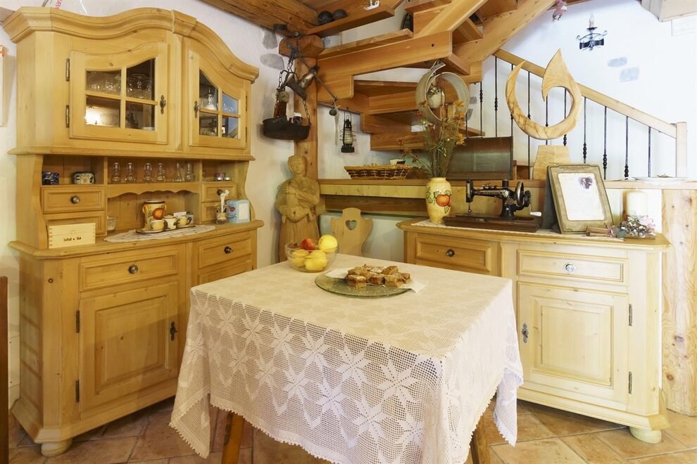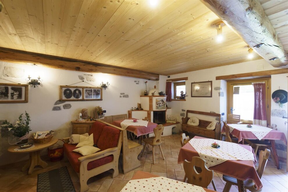 L'ampio salone, riscaldato da una grande stufa ad ole, è l'ideale per rilassarsi e trascorrere una tranquilla serata in compagnia davanti al fuoco. Il soffitto il legno e l'arredamento conferiscono all'ambiente calore e pace.