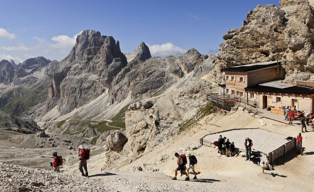 - continuare lungo la valle del Vajolet fino al passo Principe a quota 2600 m, dove si trova il nostro rifugio (ore 1.10).