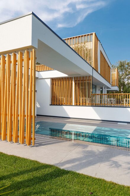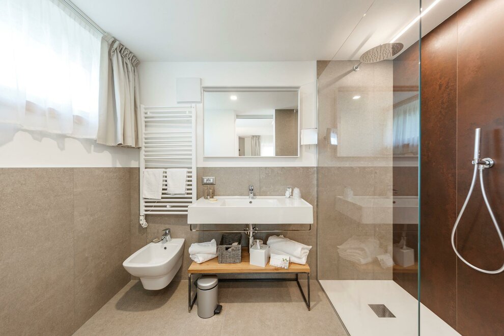 La luce che filtra dall'ampia terrazza lato sud o dal patio valorizza i materiali ricercati che impreziosiscono l'ambiente. Il legno di rovere e il gres porcellanato rivestito di kerlite si sposano alla perfezione in un connubio di naturalezza e design.