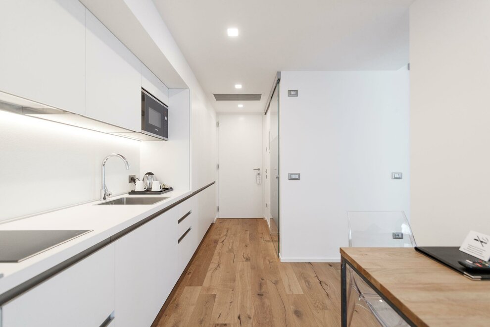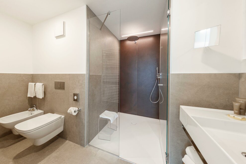 a luce che filtra dall’ampia terrazza lato sud o dal patio valorizza i materiali ricercati che impreziosiscono l’ambiente. Il legno di rovere e il gres porcellanato rivestito in kerlite si sposano alla perfezione in un connubio di naturalezza e design.