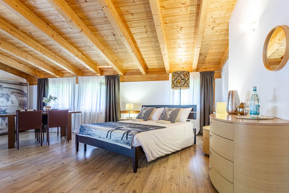La particolare spaziosità di questa camera si gioca sulle tonalità calde e luminose del legno d'abete sbiancato, del pavimento in netto contrasto con il wengè, del letto matrimoniale e del tavolo multifunzioni posto dinanzi alla grande vetrata che affaccia su un ampio terrazzo coperto, sobriamente arredato con dettagli in legno, dal quale si gode di una impagabile vista di Vetriolo Terme e di Cima Panarotta. Al centro della camera due chaise longue garantiscono piacevoli momenti di relax da dedicare alla lettura, all'ascolto di musica o a guardare la tv. Particolare attenzione merita la sala da bagno la cui eleganza è dovuta alla mescolanza di colori e materiali combinati in sobria originalità: da un lato una zona bagno avvolta da una parete di caldo colore arancio, dall'altro una particolare vasca incassata in un originale pavimento trasparente dal quale si scorgono bottiglie di vini pregiati, testimonianza di amore e dedizione senza eguali alla tradizione della viticultura trentina