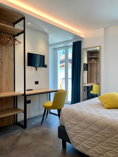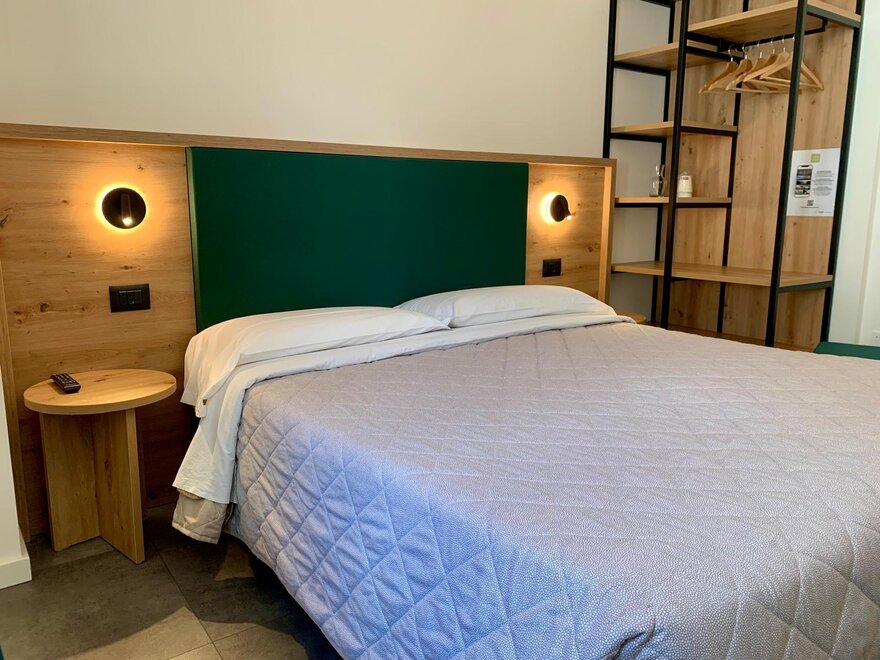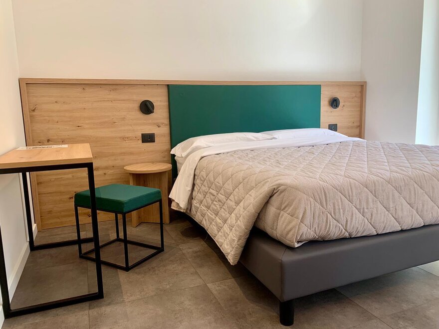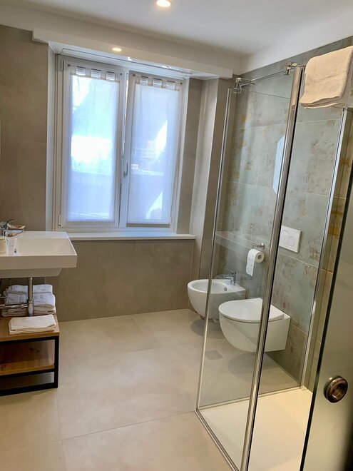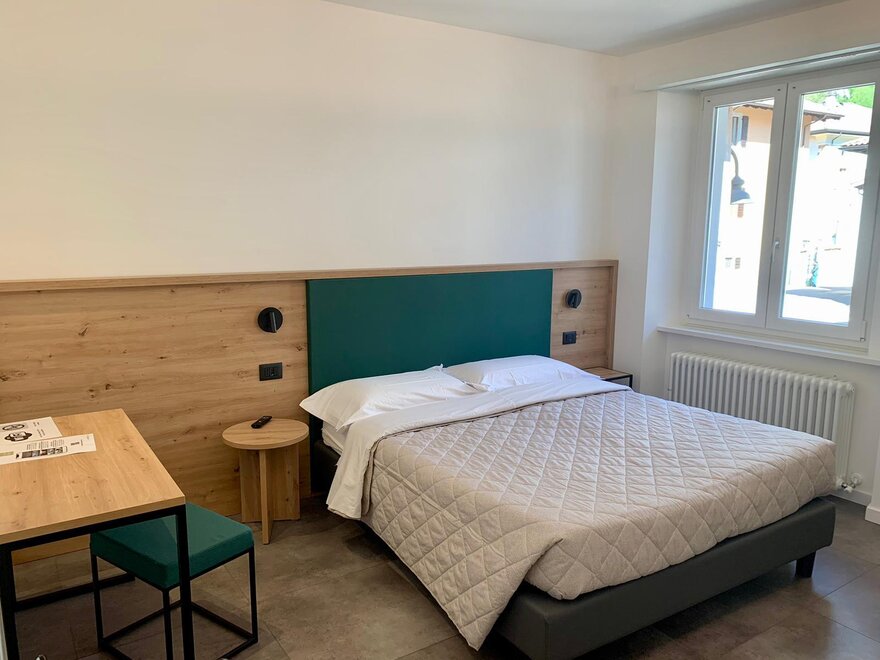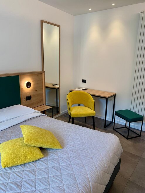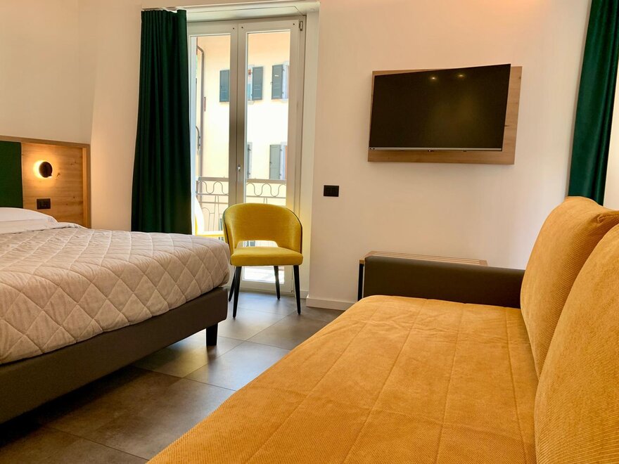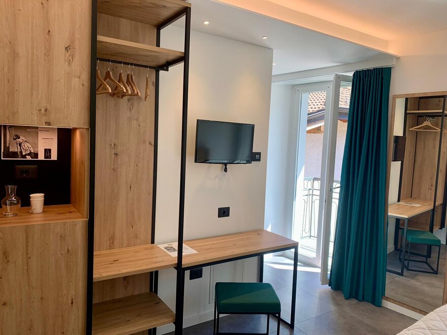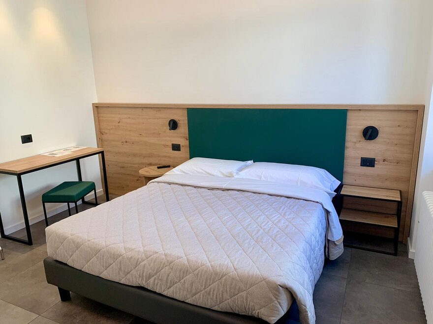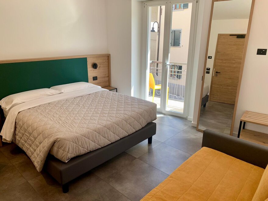 Camera doppia con balcone completamente rinnovata, insonorizzata e confortevole con bagno privato e ampia doccia, linea cortesia, asciugacapelli, tv, WI-FI gratuito in tutte le camere.