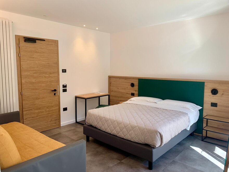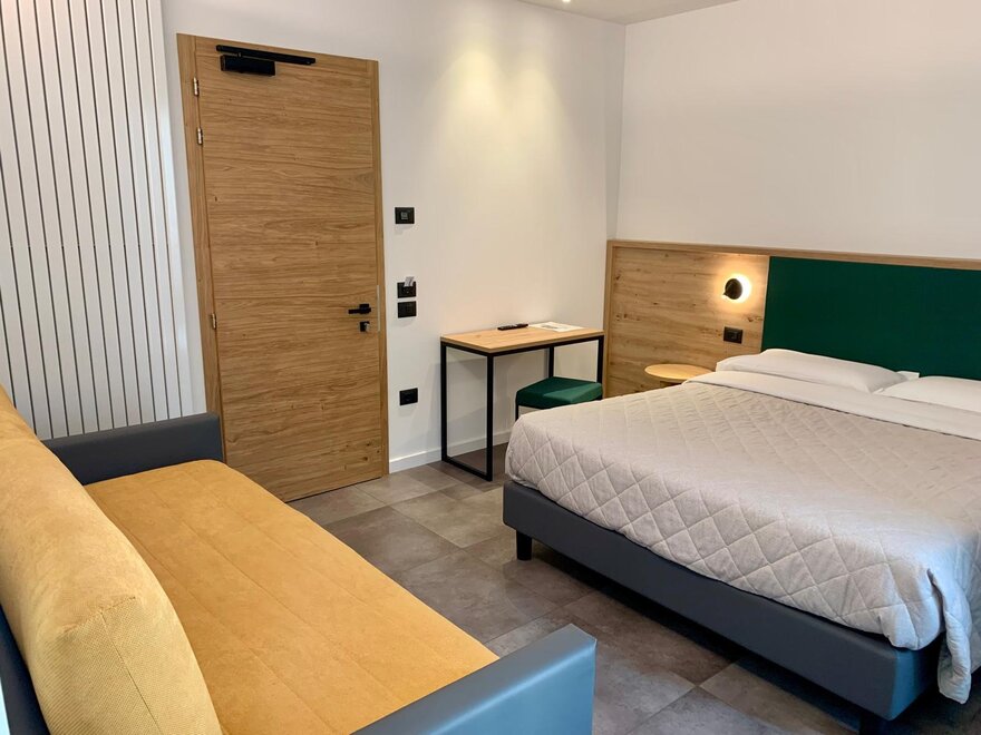Camera famigliare con letto a castello o divano letto completamnte rinnovata, bagno con ampia doccia, Wi-fi gratuito, asciugacapelli, tv. E' possibile richiedere gratuitamente l'aggiunta di un lettino da campeggio.