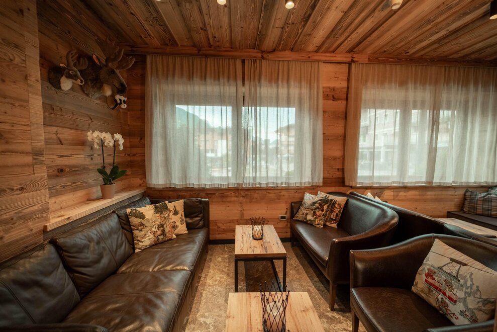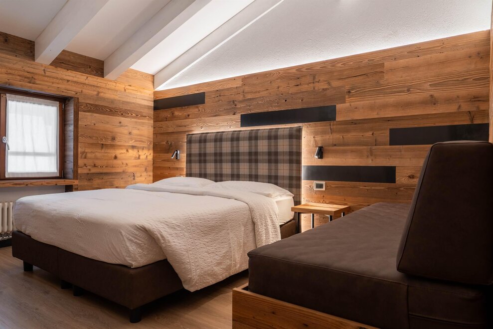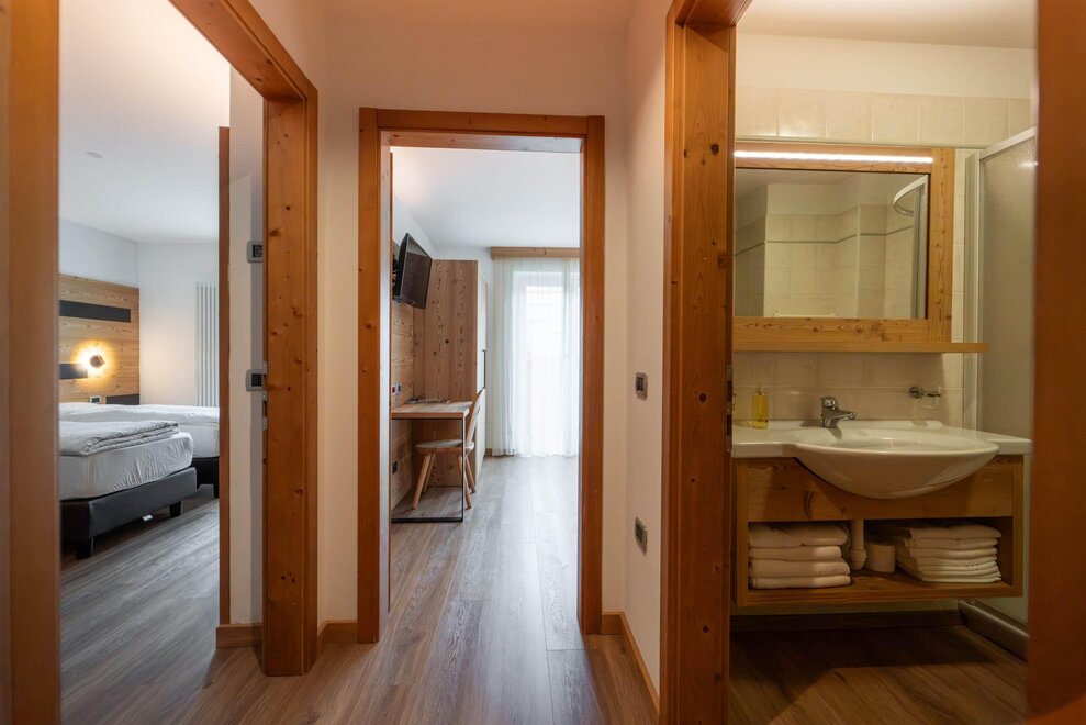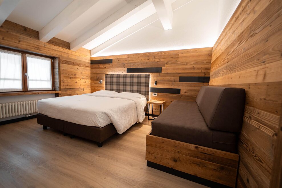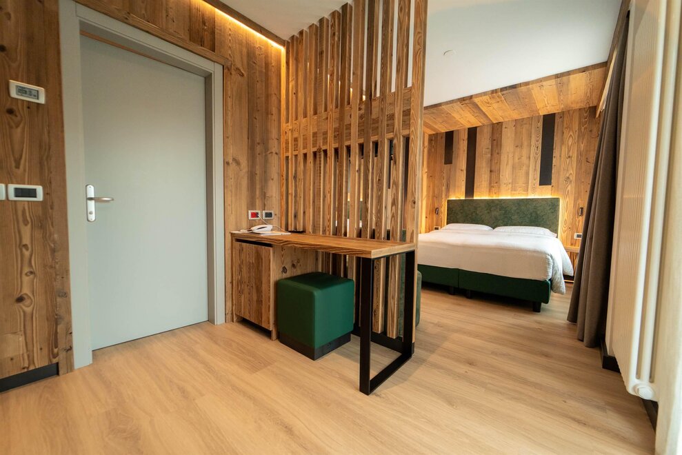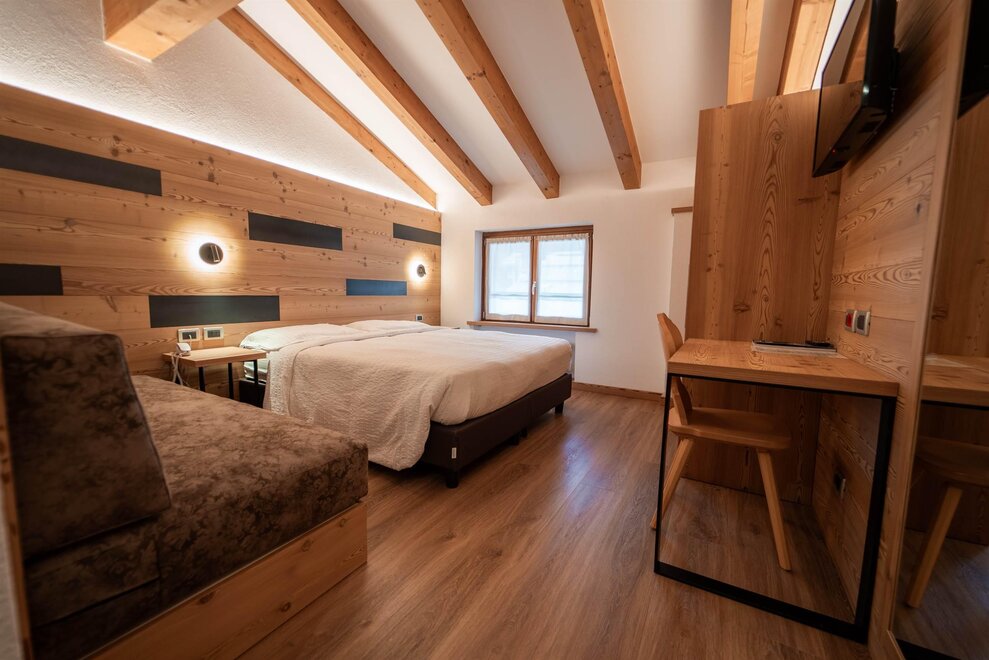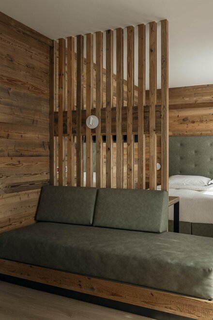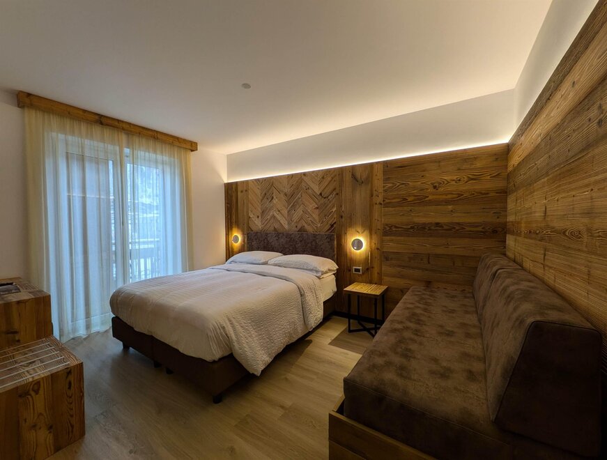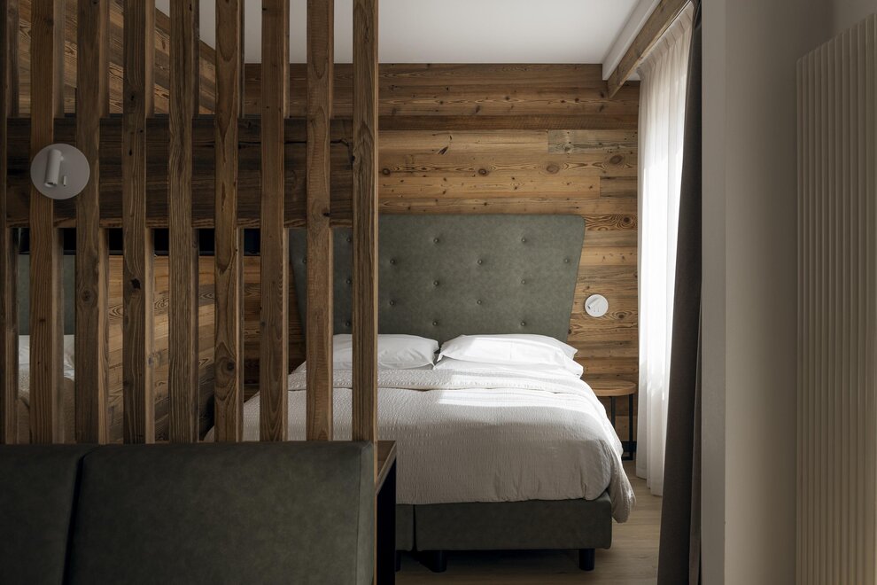 La Junior Room è una soluzione ideale per famiglie o piccoli gruppi. Composta da una camera matrimoniale e una seconda stanza comunicante con due letti singoli, offre ampi spazi e comfort. Entrambe le stanze sono arredate in stile alpino e dotate di armadio, scrivania e TV. Condividono un bagno spazioso. Su richiesta è possibile aggiungere un quinto letto o una culla nella camera matrimoniale.