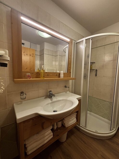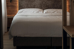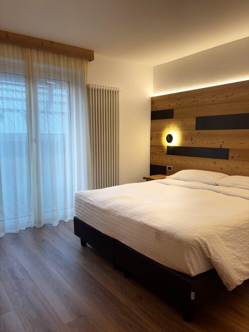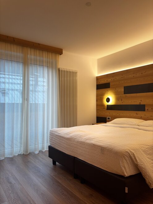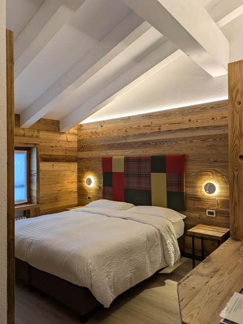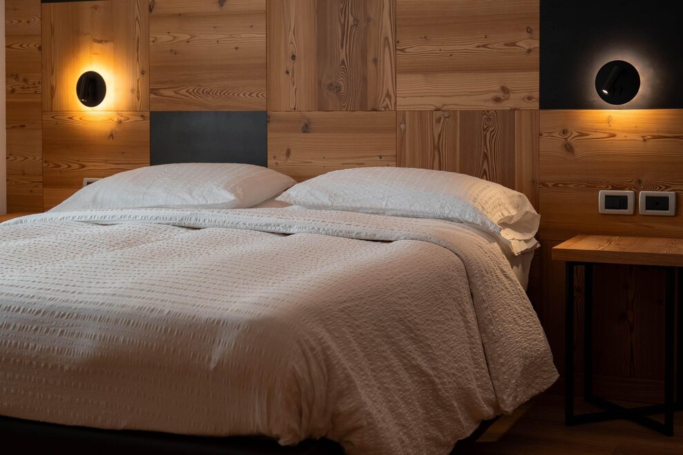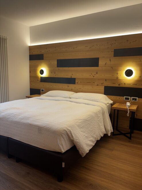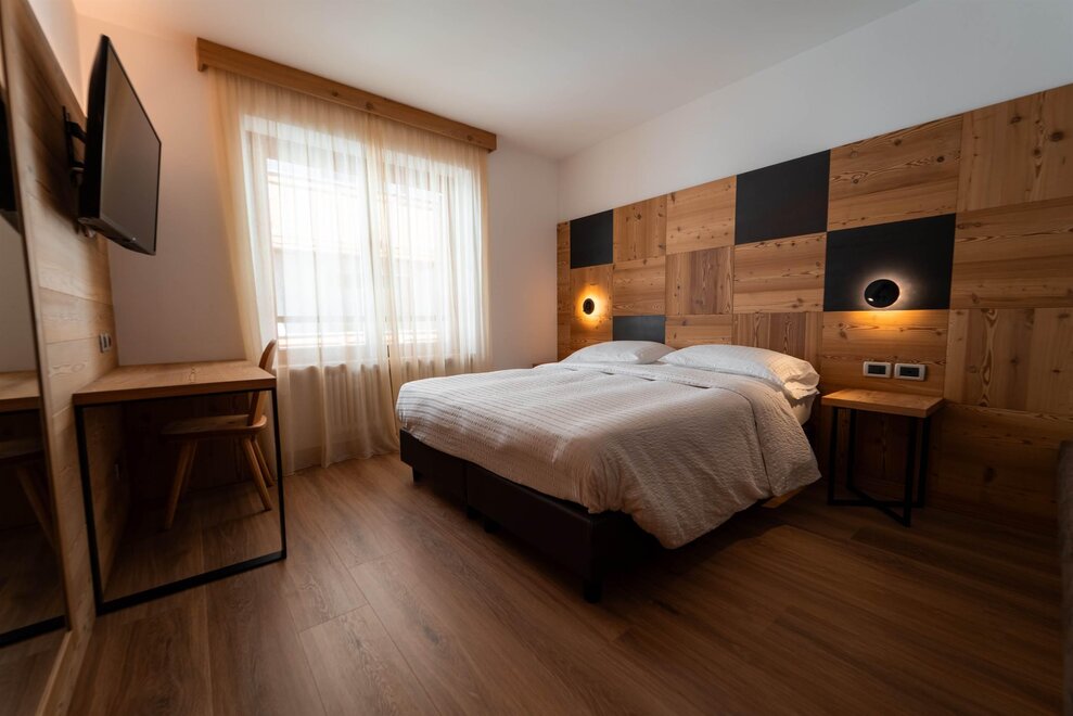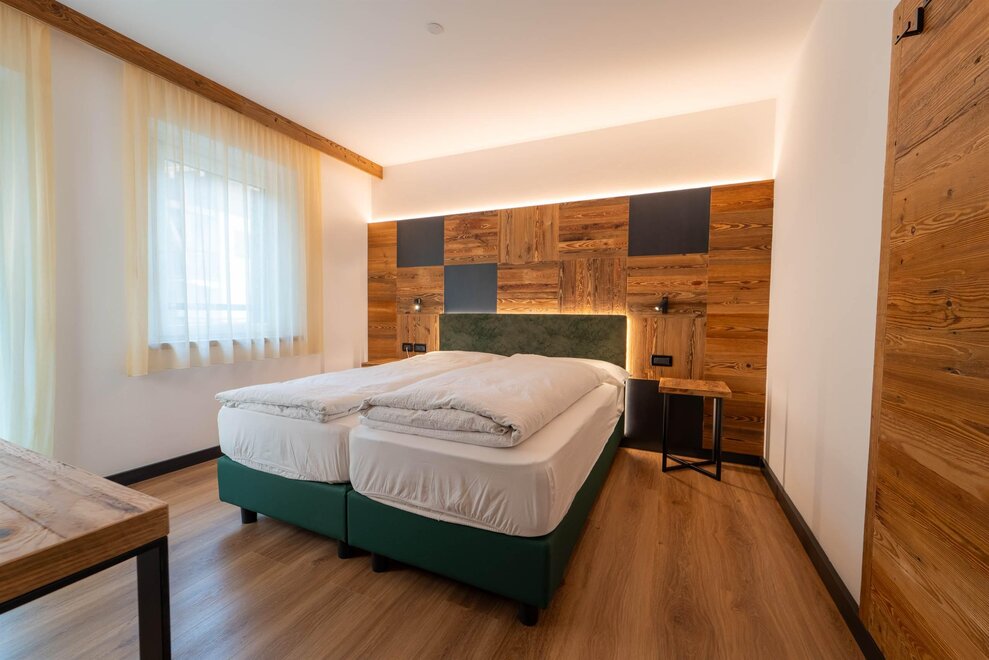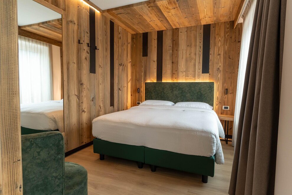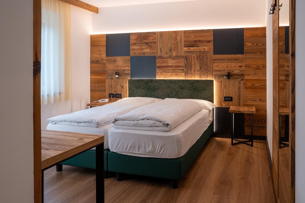 Eleganza essenziale e comfort si incontrano nella Camera Dolomiti, rifinita con legno di larice e dettagli in stile alpino. Il pavimento in legno contribuisce a creare un’atmosfera calda e raffinata. Il balcone regala una piacevole vista sulle montagne, perfetta per iniziare la giornata o rilassarsi al tramonto. Dispone inoltre di un ampio armadio pensato per soggiorni prolungati, bagno con doccia, TV, cassaforte e Wi-Fi gratuito. Su richiesta, letti singoli.