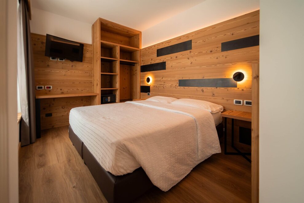 Semplice e accogliente, la camera Classica è arredata in legno in stile alpino, con spazi ben organizzati e una calda atmosfera di montagna. Ideale per coppie o viaggiatori singoli, offre un bagno con doccia, TV, cassaforte e Wi-Fi gratuito. Su richiesta, può essere preparata con letti singoli.