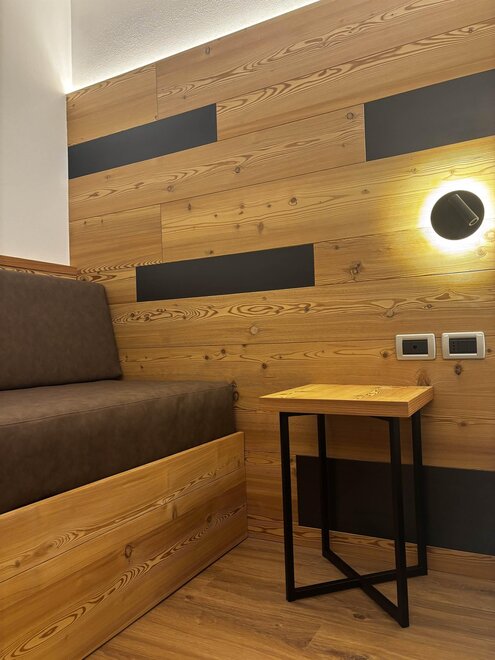 Pensata per garantire comfort e privacy, la Family Room si compone di due camere separate: una matrimoniale e una tripla, ideali per famiglie o piccoli gruppi. L’arredamento moderno in legno di larice e il pavimento in legno creano un ambiente caldo e accogliente. Entrambe le stanze sono dotate di armadio, scrivania e TV, e condividono un bagno spazioso con doccia.