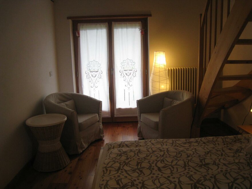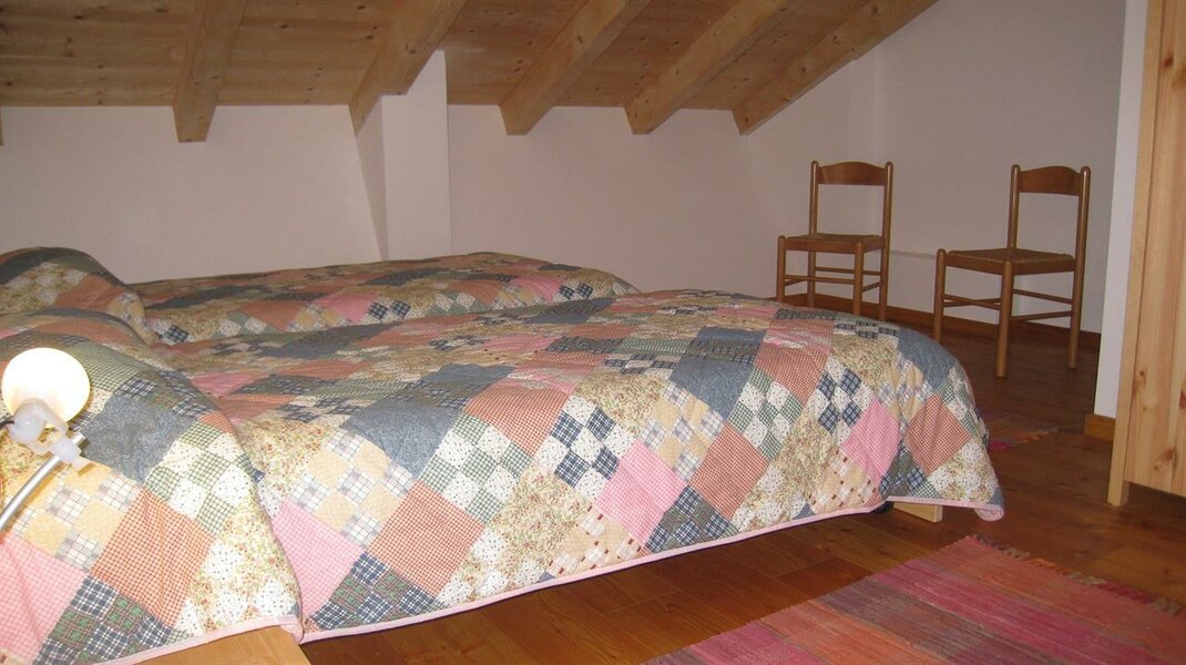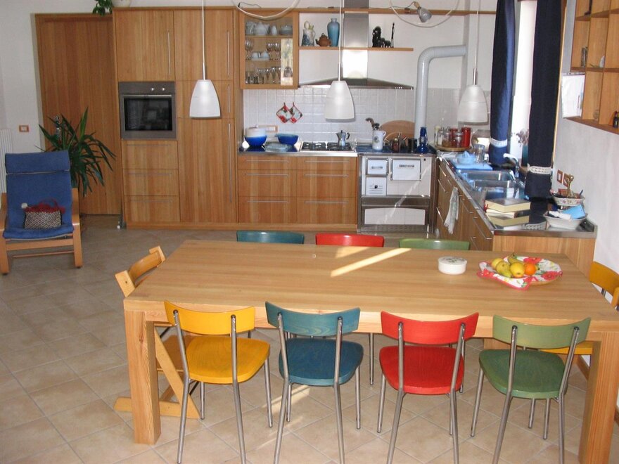 Ampia e luminosa stanza matrimoniale al secondo piano, con bagno e balcone. Galleria soppalco grande quanto una seconda stanza dove si trovano due letti singoli avvicinabili "su rotaie", con la possibilità di aggiungerne un terzo. Doccia/wc dotato di finestra. Balcone. Arredamento in legno naturale oliato e cerato, senza vernici nocive. Dettagli in verde. I letti sono naturalmente dotati di biancheria, normalmente piumino estivo o invernale. Se però gli ospiti richiedono la soluzione più classica di lenzuola abbinate a coperte, questo è possibile. La biancheria viene cambiata ogni volta che si rende necessario ed almento ogni 3/4 giorni. Per il lavaggio usiamo solo detergenti ecologici completamente biodegradabili. Al piano terra, per uso occasionale, ma molto comoda per le famglie con bambini, si trova una cucina con frigo, freezer e piano cottura.