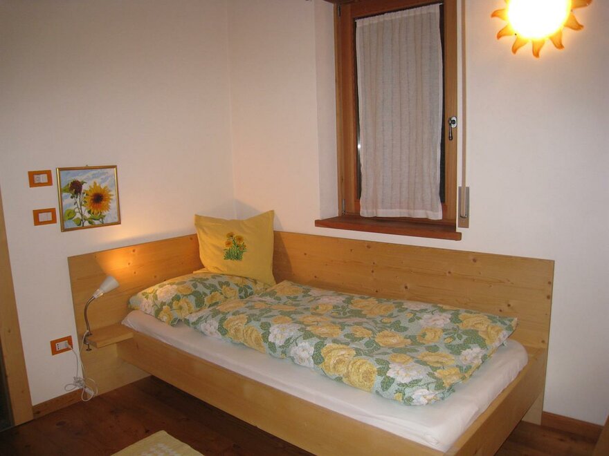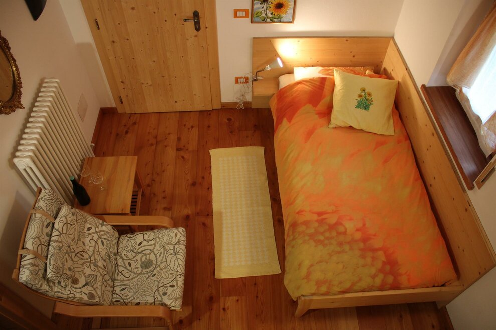 Camera spaziosa e luminosa con finestra vista bosco, doccia/wc privato, un letto singolo (200x90). Ampio soppalco in legno con un secondo letto singolo, finestra velux. Dettagli in giallo e arancione, come il fiore. Il legno naturale degli arredi e della struttura garantiscono una calda accoglienza. I letti sono naturalmente dotati di biancheria, normalmente piumino estivo o invernale. Se però gli ospiti richiedono la soluzione più classica di lenzuola abbinate a coperte, basta chiedere. La biancheria viene cambiata ogni volta che si rende necessario ed almento ogni 3/4 giorni. Per il lavaggio usiamo solo detergenti ecologici completamente biodegradabili. Al piano terra per uso occasionale si trova anche una cucina con frigo, freezer e piano cottura, a disposizione degli ospiti.