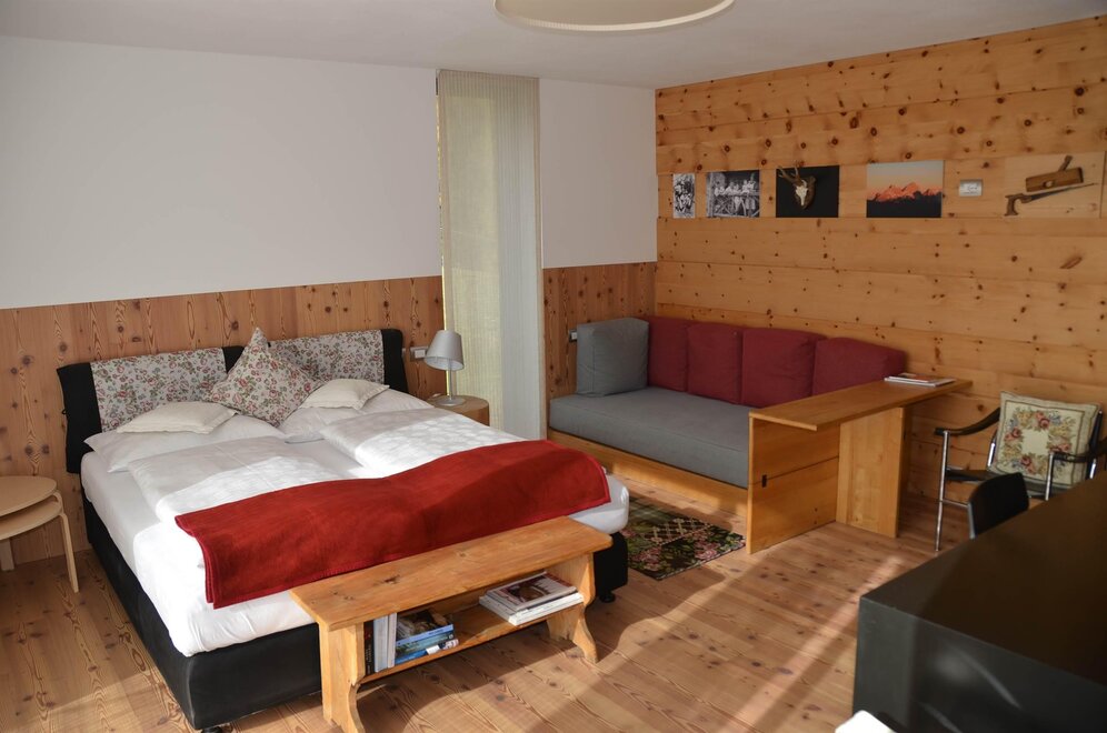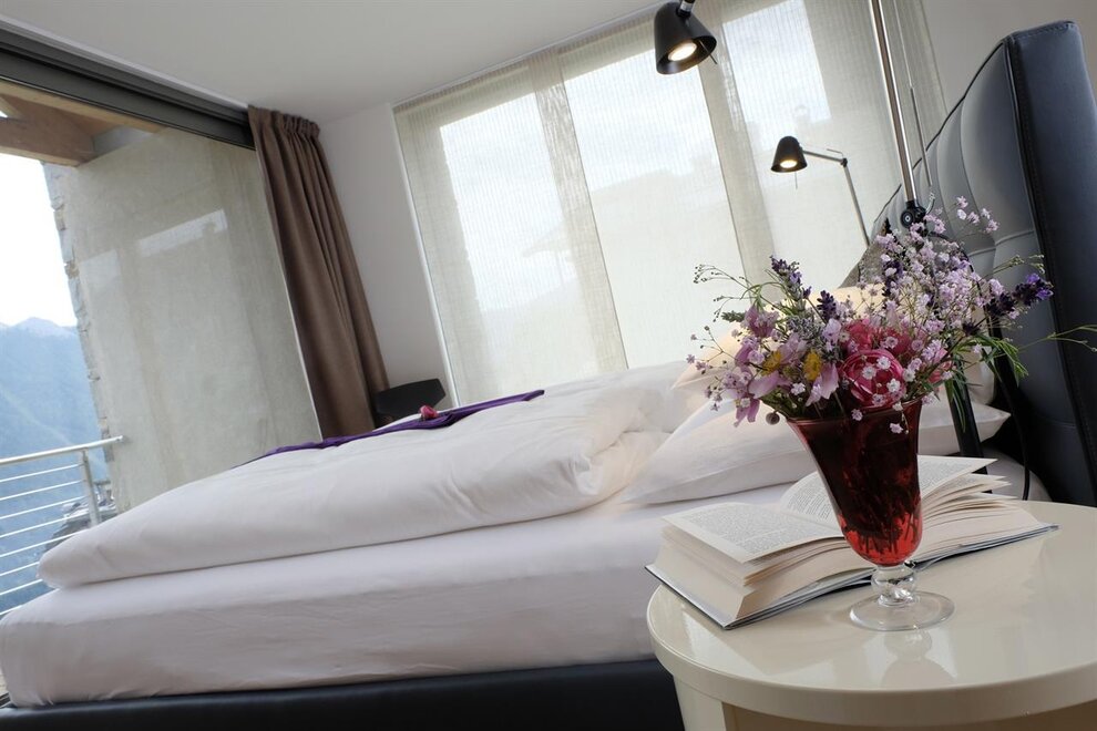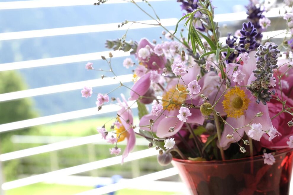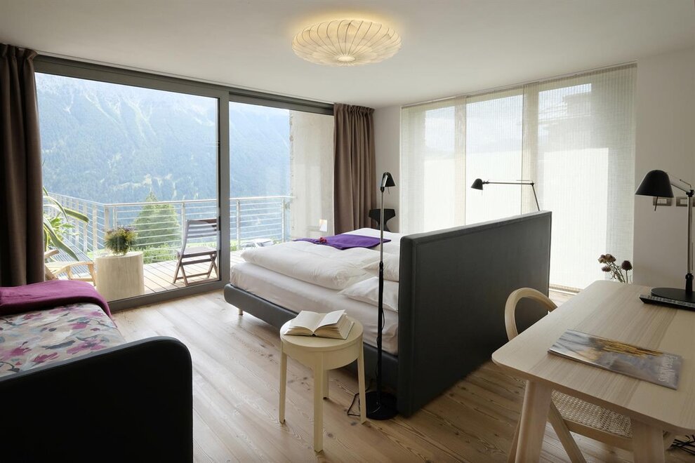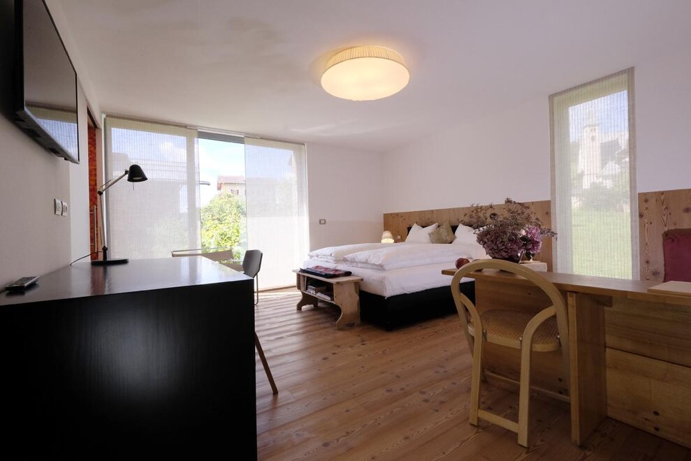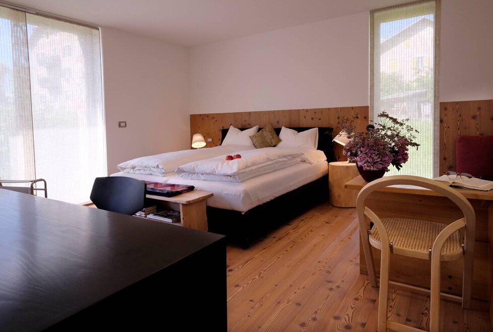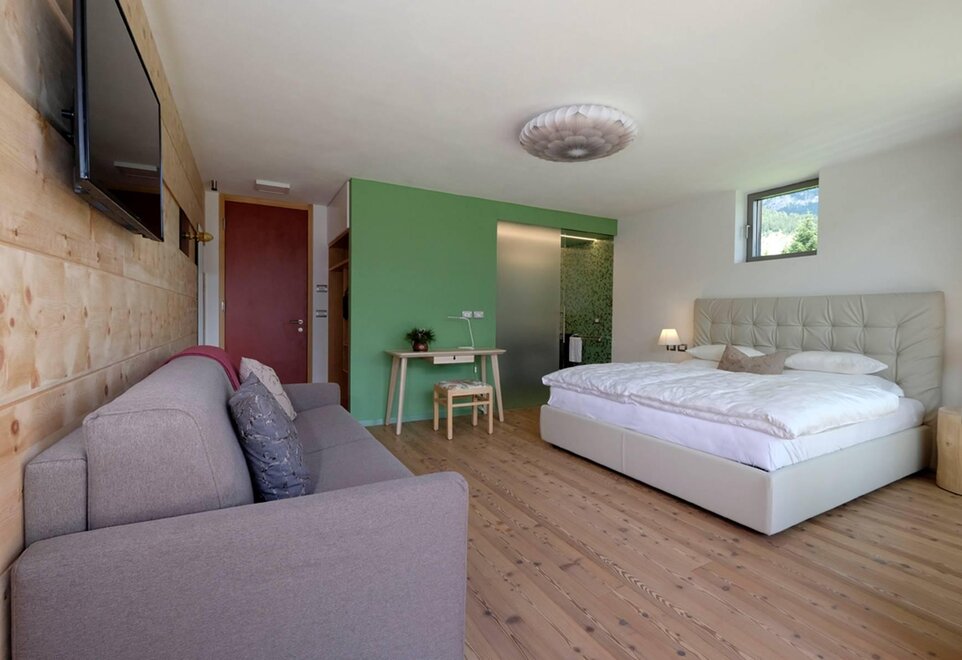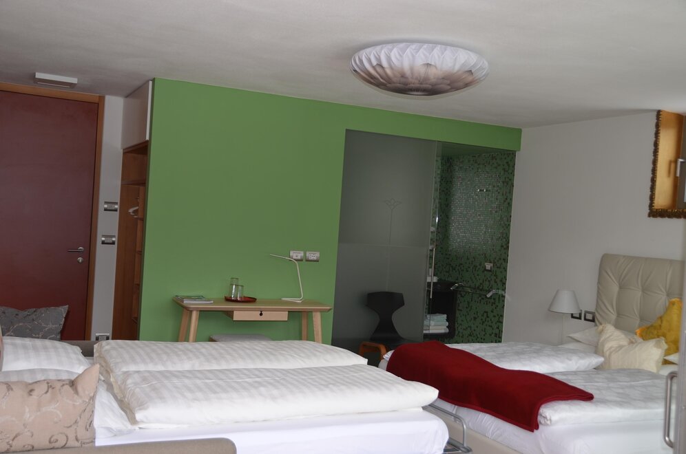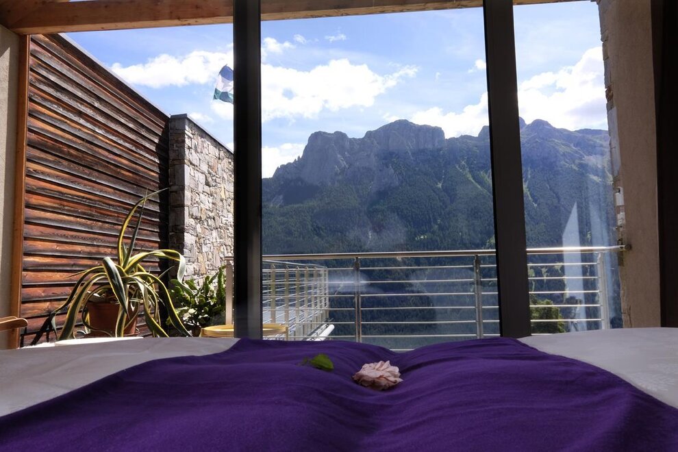 La camera è situata verso sud-est con ampia terrazza verso la valle, l’interno è arredato in modo elegante e ricercato, il letto è posizionato al centro della stanza rivolto verso la grande vetrata. Vanta una vista mozzafiato sul giardino, i prati e le montagne. Il pavimento è in legno di larice ed il rivestimento di una parete è in legno di cirmolo naturale. La camera è dotata anche di un divano che all’occorrenza può diventare un comodo letto, TV a parete, scrivania e cabina/armadio aperto in legno. Il bagno in mosaico ha una gamma di colori che va dal turchese al viola con lavandino, wc ed ampia doccia. La camera a richiesta può essere collegata con la camera Erika. Malva: “una pianta perenne di colore rosa violaceo con striature scure che cresce nei prati e spesso spontanea negli orti e giardini, dotata di virtù benefiche, emollienti e antiinfiammatorie contro la tosse. Il nome deriva dal termine latino “mollire” cioè capace di ammorbidire ...”