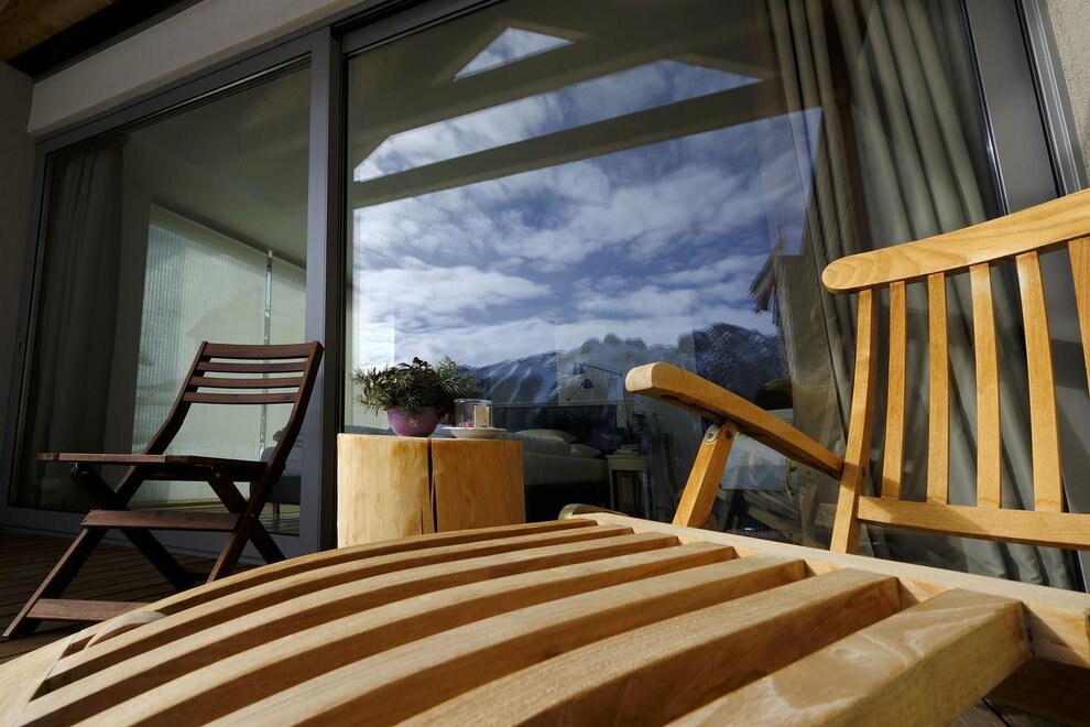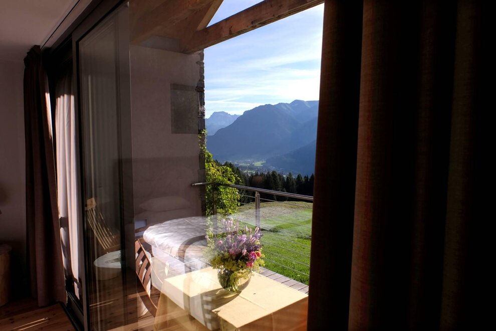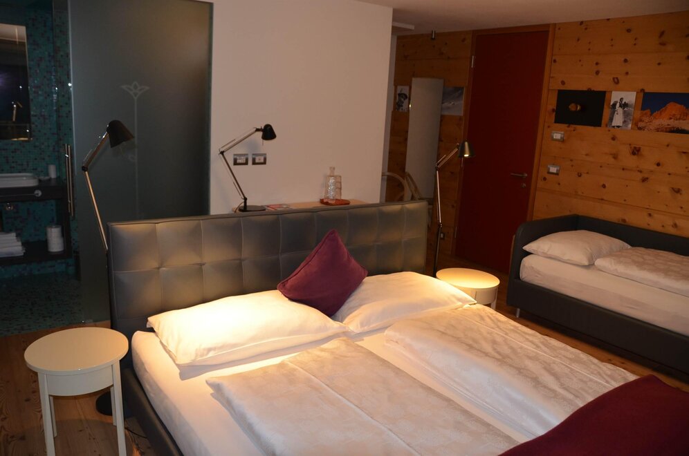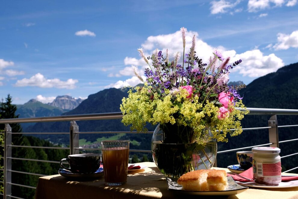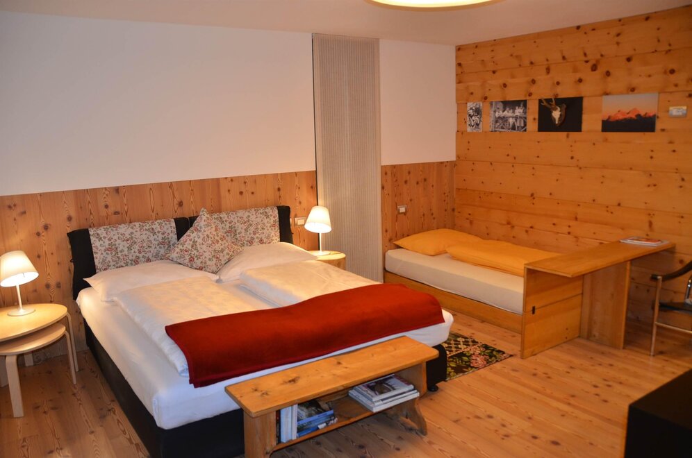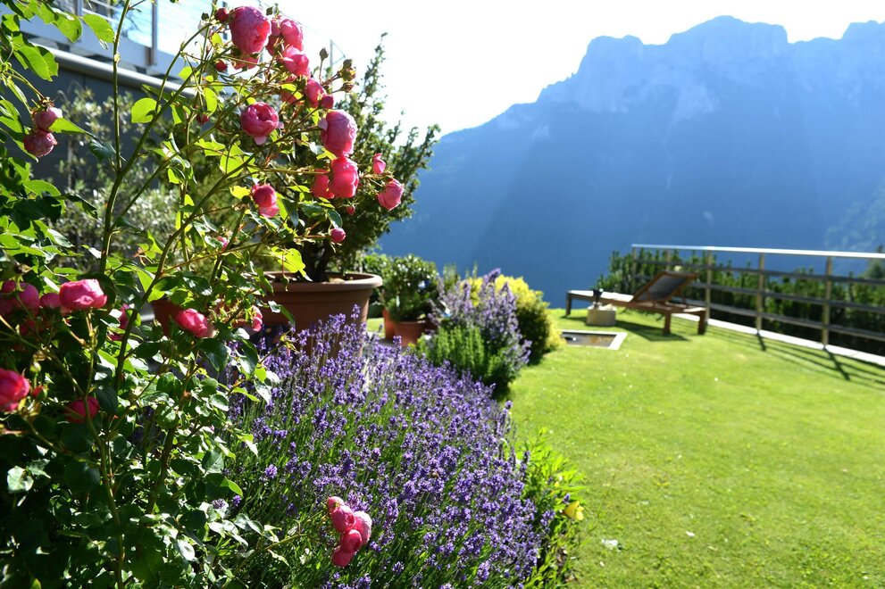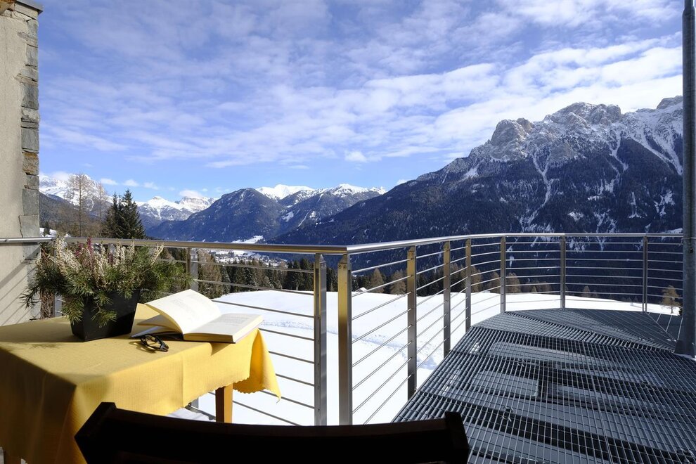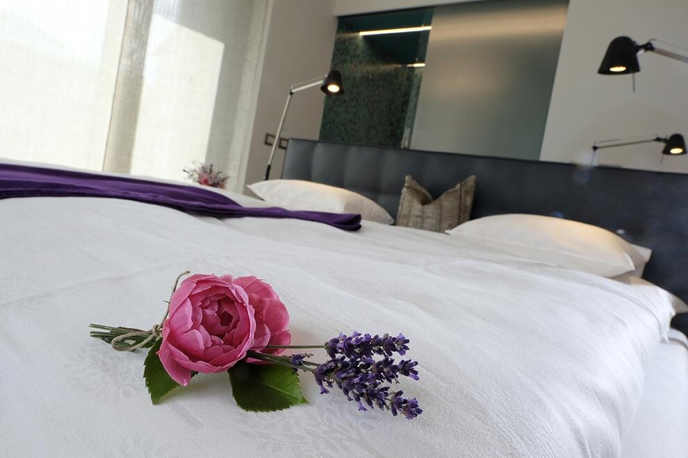 La camera è situata verso sud-est con ampia terrazza verso la valle, l’interno è arredato in modo elegante e ricercato, il letto è posizionato al centro della stanza rivolto verso la grande vetrata. Vanta una vista mozzafiato sul giardino, i prati e le montagne. Il pavimento è in legno di larice ed il rivestimento di una parete è in legno di cirmolo naturale. La camera è dotata anche di un divano che all’occorrenza può diventare un comodo letto, TV a parete, scrivania e cabina/armadio aperto in legno. Il bagno in mosaico ha una gamma di colori che va dal turchese al viola con lavandino, wc ed ampia doccia. La camera a richiesta può essere collegata con la camera Erika. Malva: “una pianta perenne di colore rosa violaceo con striature scure che cresce nei prati e spesso spontanea negli orti e giardini, dotata di virtù benefiche, emollienti e antiinfiammatorie contro la tosse. Il nome deriva dal termine latino “mollire” cioè capace di ammorbidire ...”