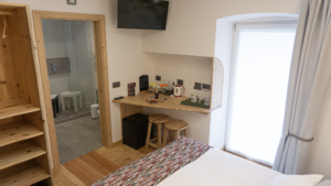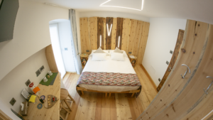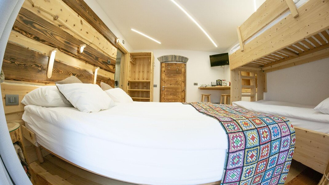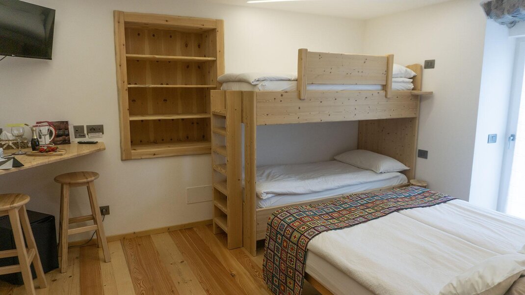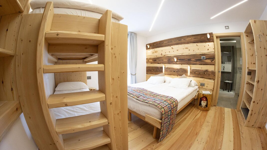 Tutto è pensato per le vostre esigenze: 2 letti singoli che possono diventare un matrimoniale, un comodo e funzionale letto a castello realizzato interamente a mano dal nostro falegname di fiducia – lo stesso che ha curato con stile e professionalità tutto l’arredamento – e 3 comodini in legno di cirmolo, di cui 2 impreziositi da simpatici intagli raffiguranti gnomi del bosco.