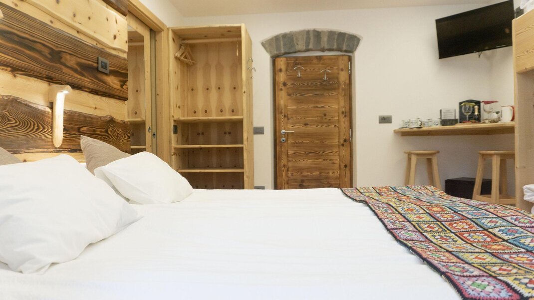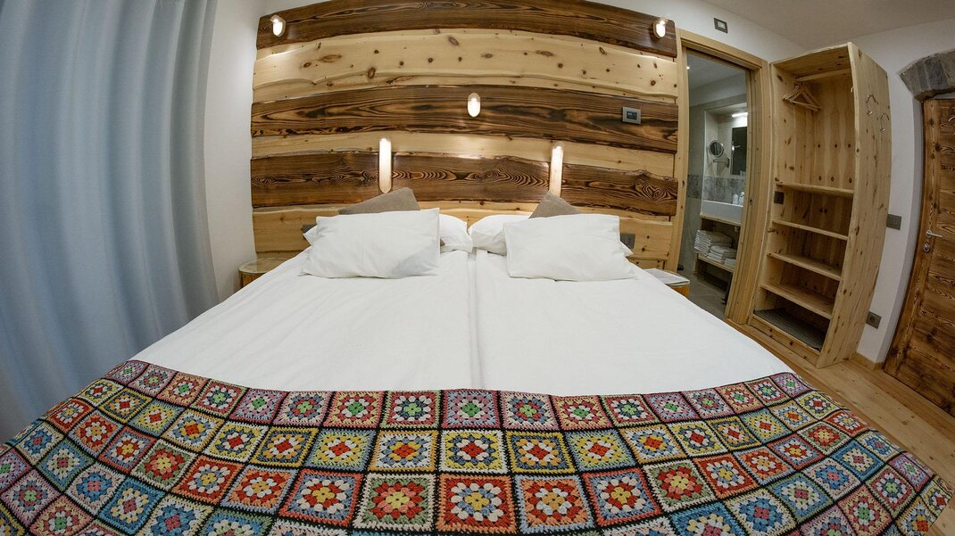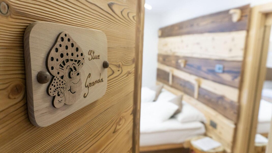 Due comodini in legno di cirmolo, impreziositi da simpatici e caratteristici intagli raffiguranti gnomi del bosco, accompagnano la parete in cirmolo e larice che funge da testiera del letto. Qui sono integrate luci a LED dimmerabili che, insieme allo stile delle luci a soffitto, donano un tocco di efficienza e modernità in perfetto contrasto con il fascino rustico della stanza.dotazioni camere/appartamenti
