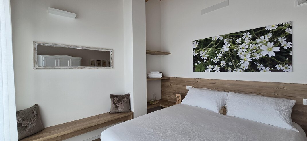 Accogliente e romantica, questa camera mansardata conquista con il suo soffitto spiovente in legno che crea un’atmosfera intima e rilassante. Gli arredi in pino donano calore e autenticità all’ambiente, regalando una piacevole sensazione di comfort e familiarità.