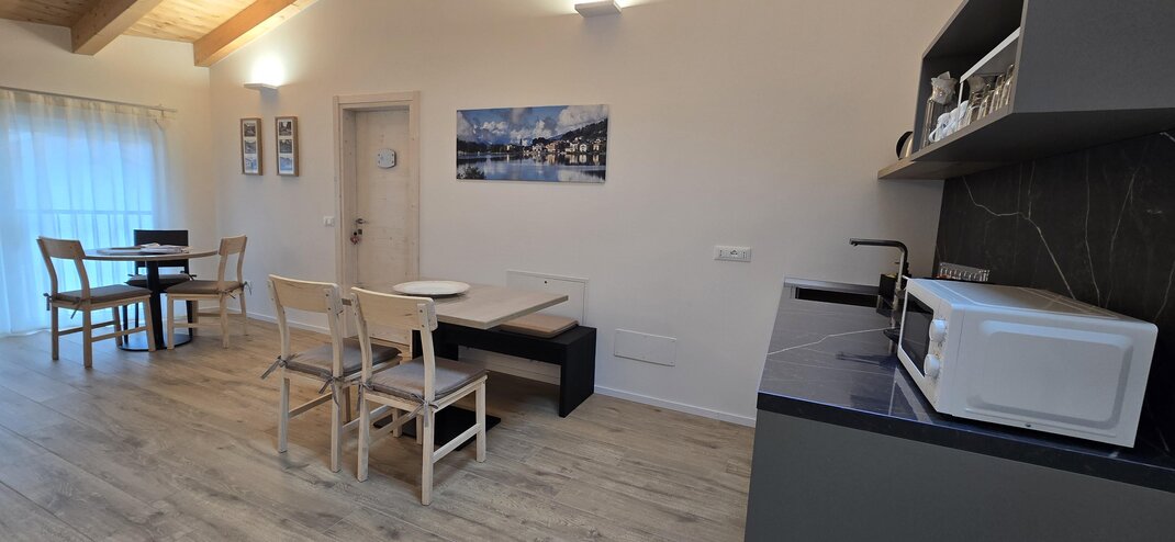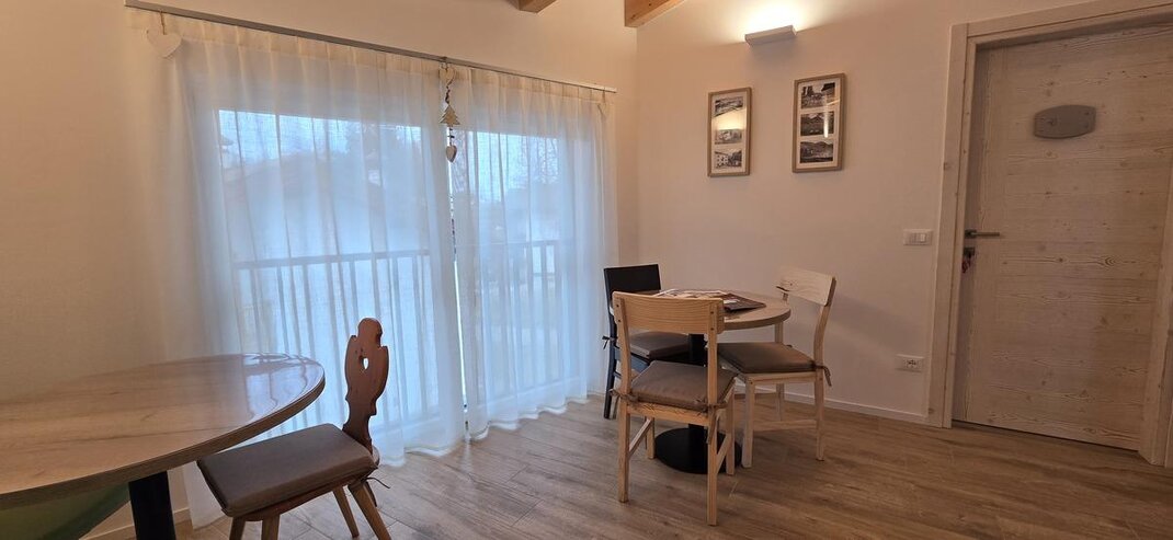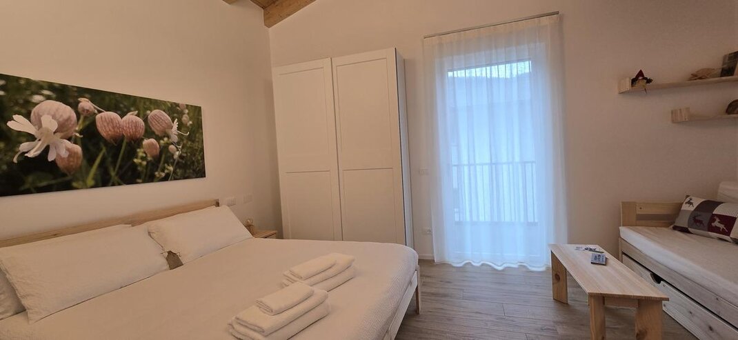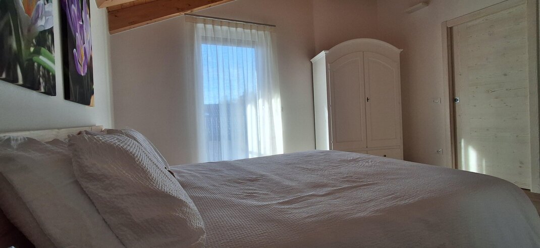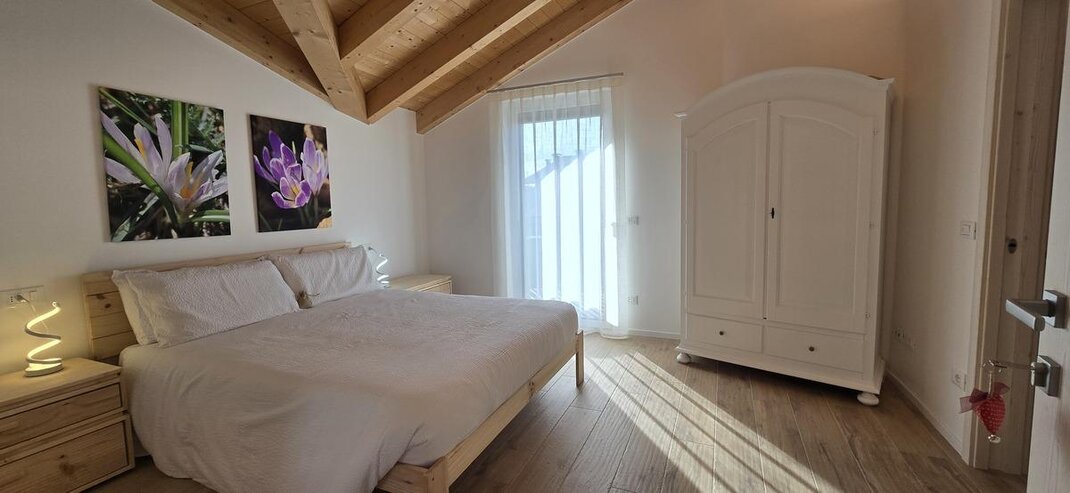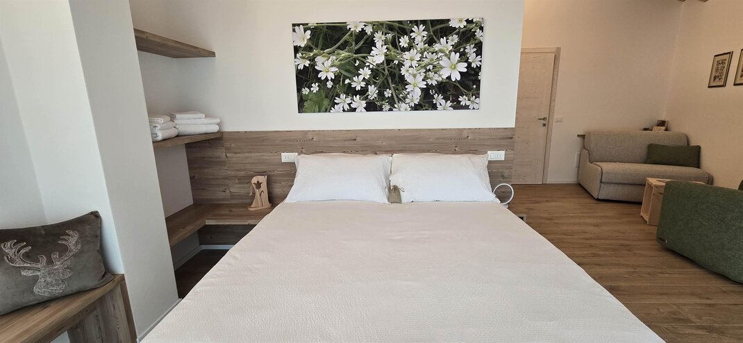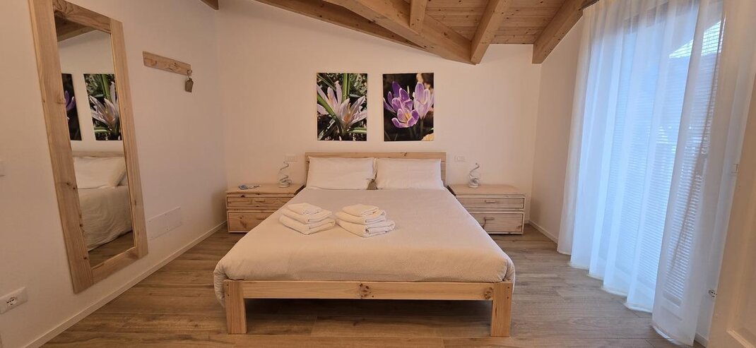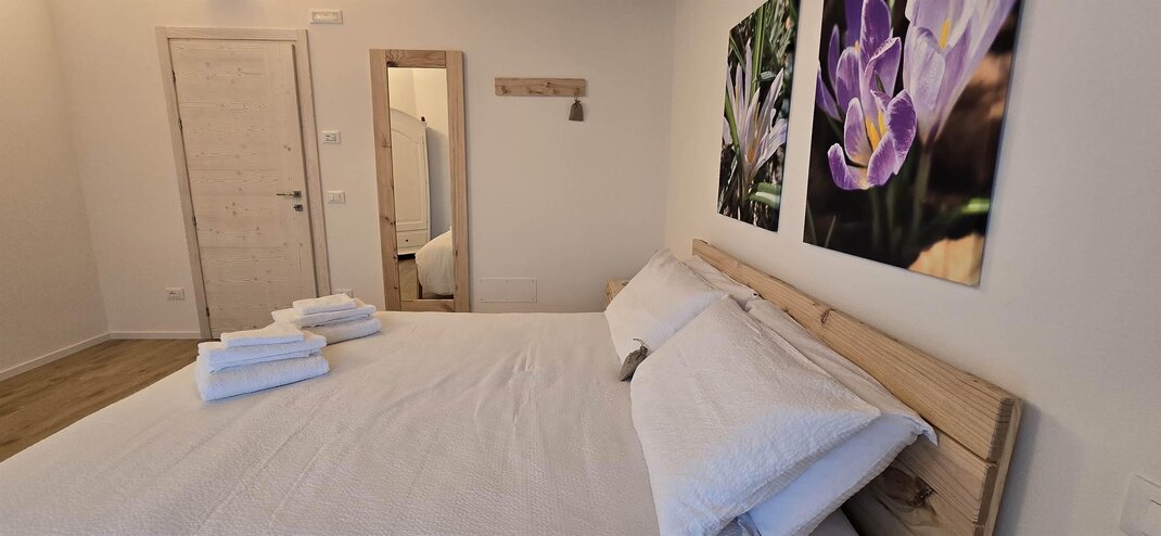 Dotata di letto matrimoniali e divano letto é perfetta per coppie o famiglie con un bambino. L’ambiente accogliente con arredi in pino trasmette un senso di calore e tranquillità. Un piccolo rifugio dove sentirsi a casa.