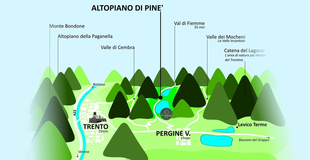 Sull'Altopiano di Pinè, nel cuore del Trentino, a soli 25 minuti da Trento, 15 minuti da Pergine Valsugana e 35 minuti dalla Valle di Fiemme.
