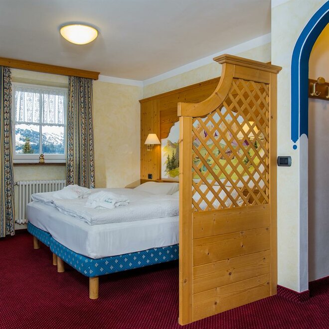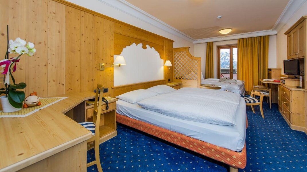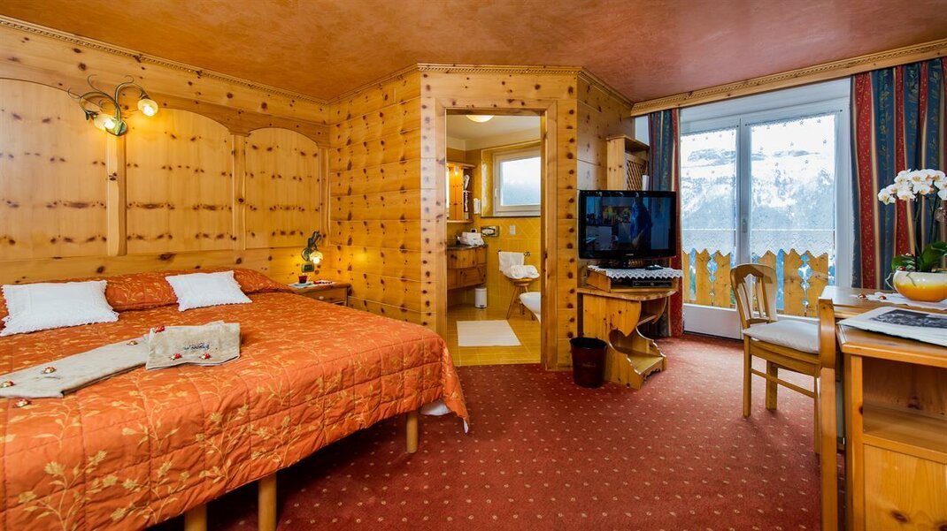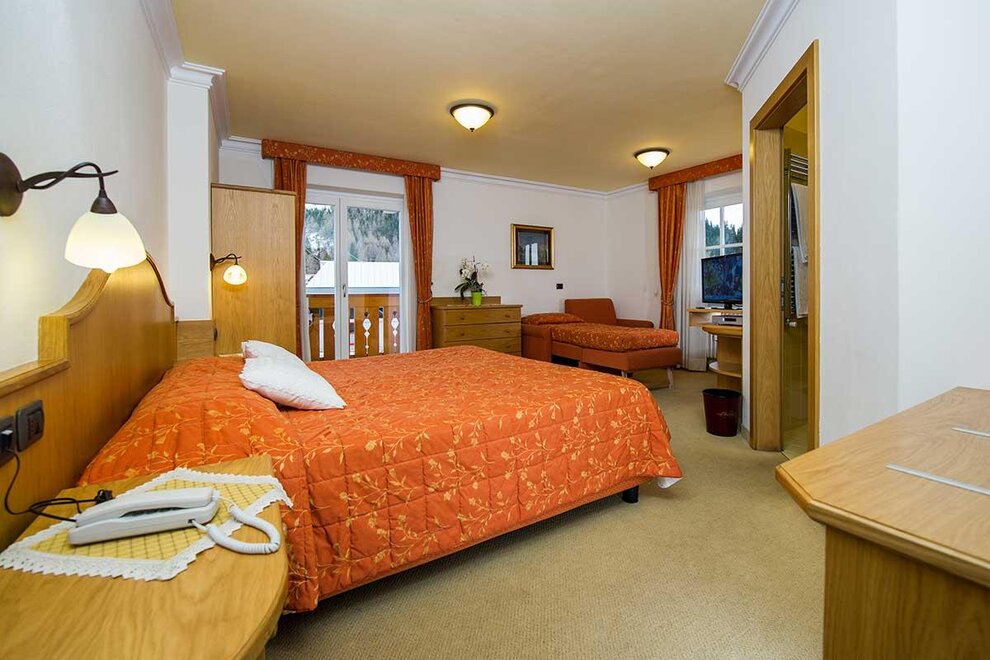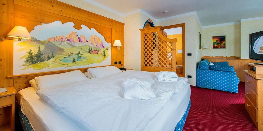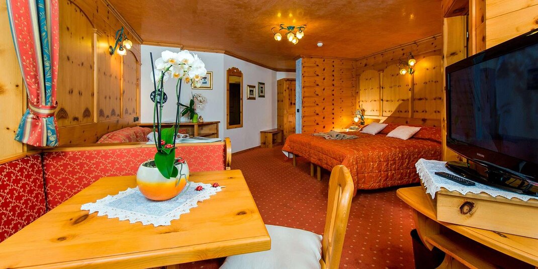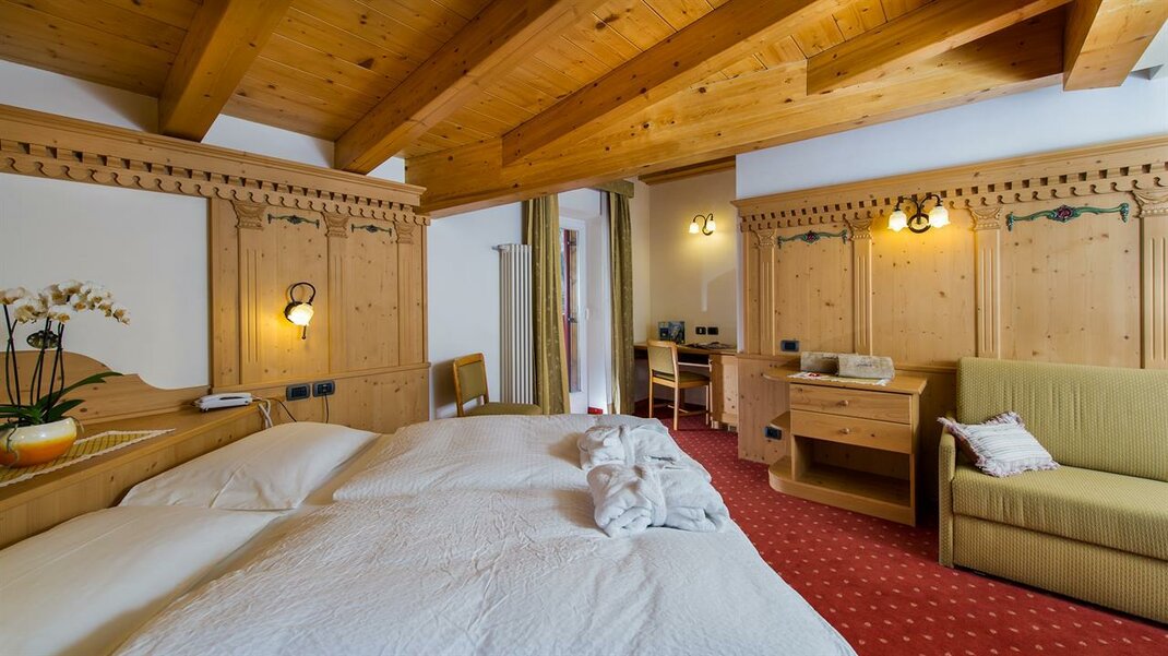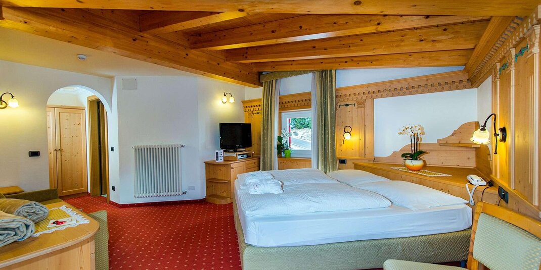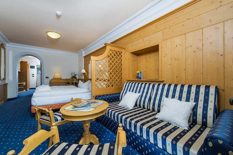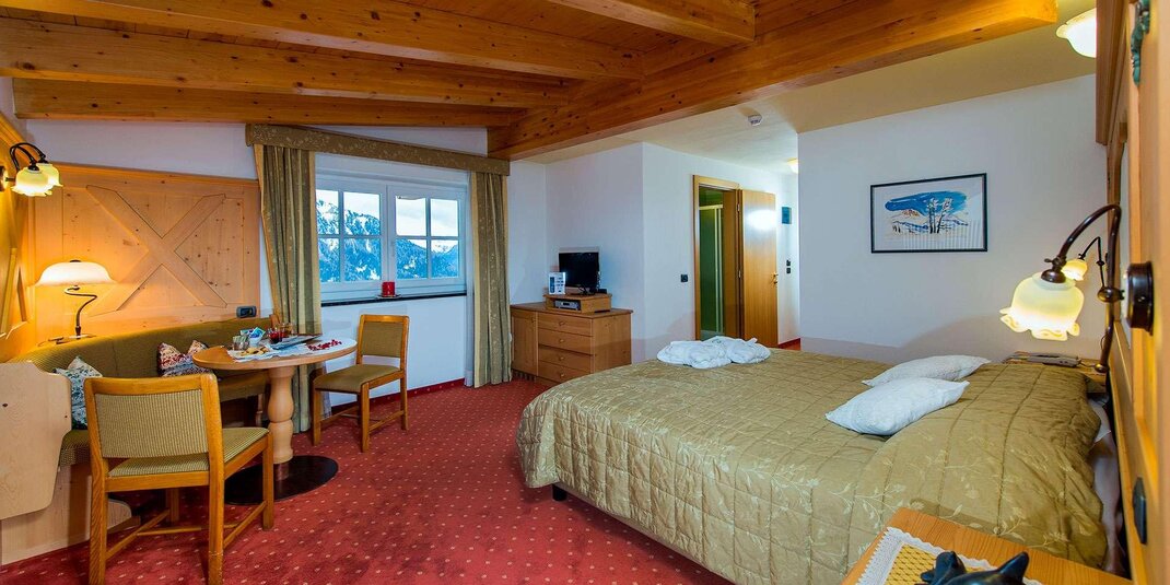 Camera molto spaziosa con salottino e arredamento rustico di montagna