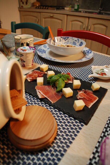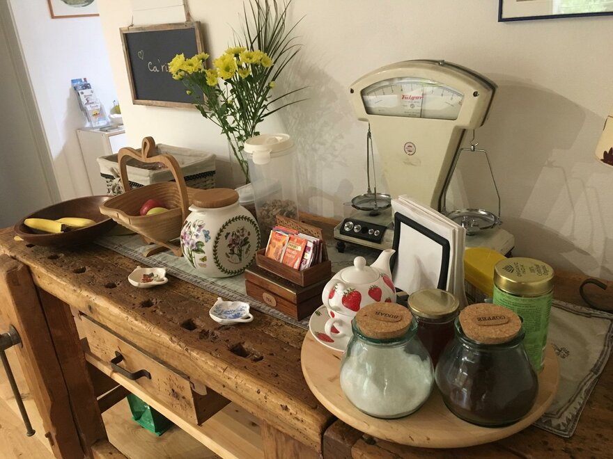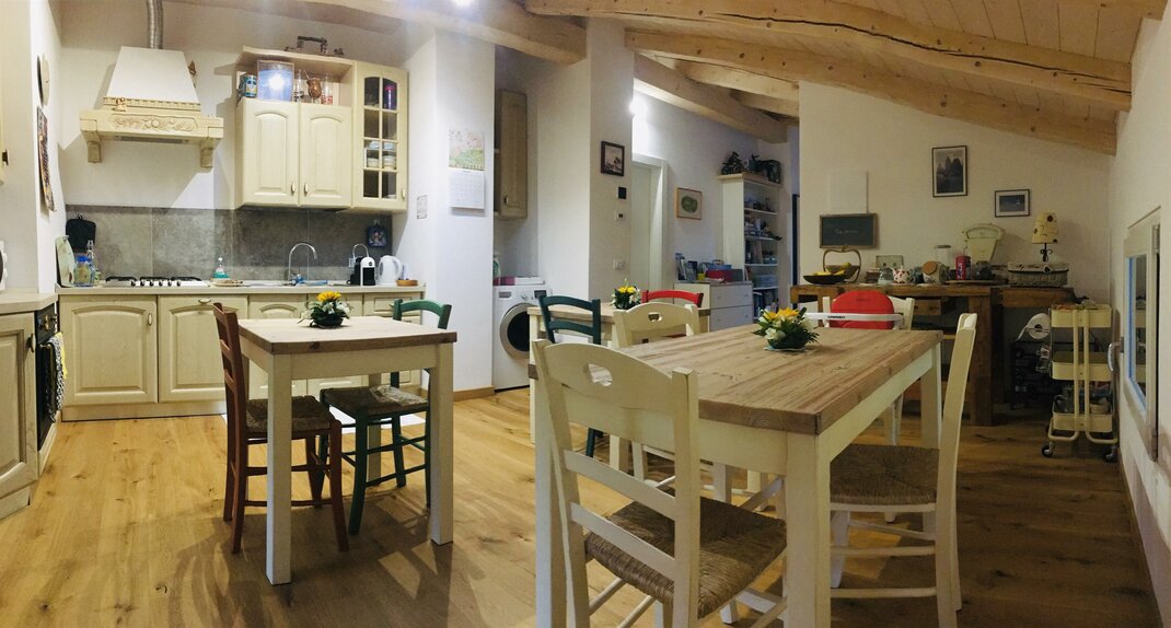 La zona giorno comune vi ospiterà al mattino per le vostre colazioni in formula self catering; offriamo frutta fresca (secondo disponibilità), yoghurt, latte, prodotti confezionati. Vi permetterà inoltre di cucinare comodamente se lo vorrete le vostre cene e/o pranzi. Troverete a vostro uso: macchina caffè, bollitore, forno microonde, tostapane, lavatrice.