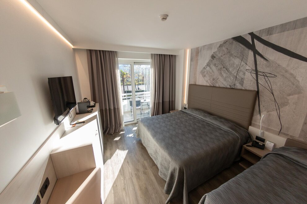 La nostra moderna camera familiare con balcone e vista sul giardino è il rifugio perfetto per famiglie che cercano spazio e comodità in un ambiente elegante. Composta da due camere separate, ciascuna con un balcone privato, offre uno splendido affaccio sul giardino curato della struttura, ideale per rilassarsi e godere del panorama.