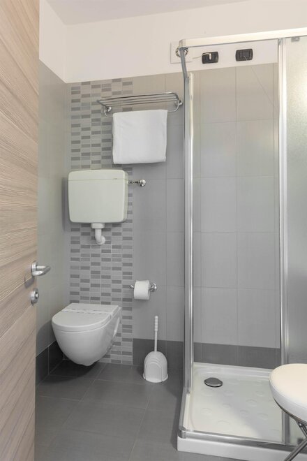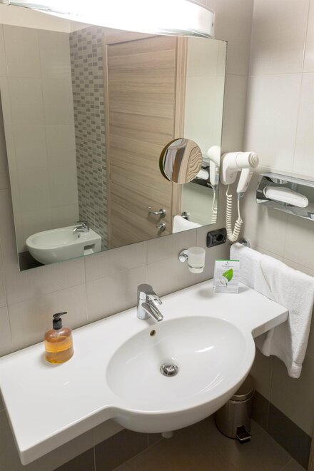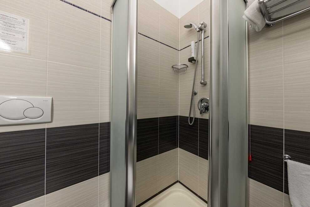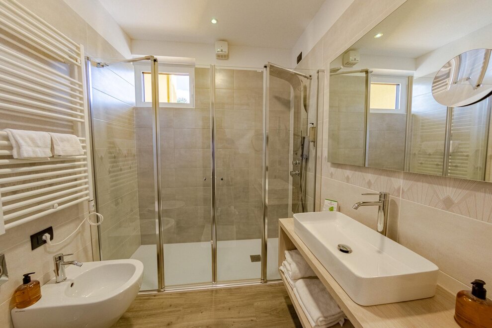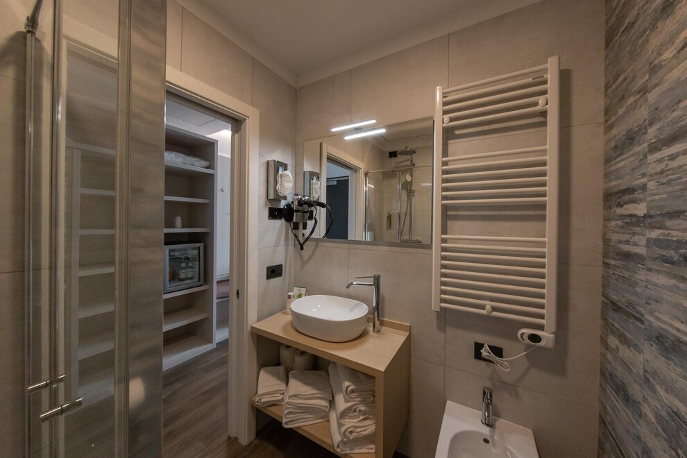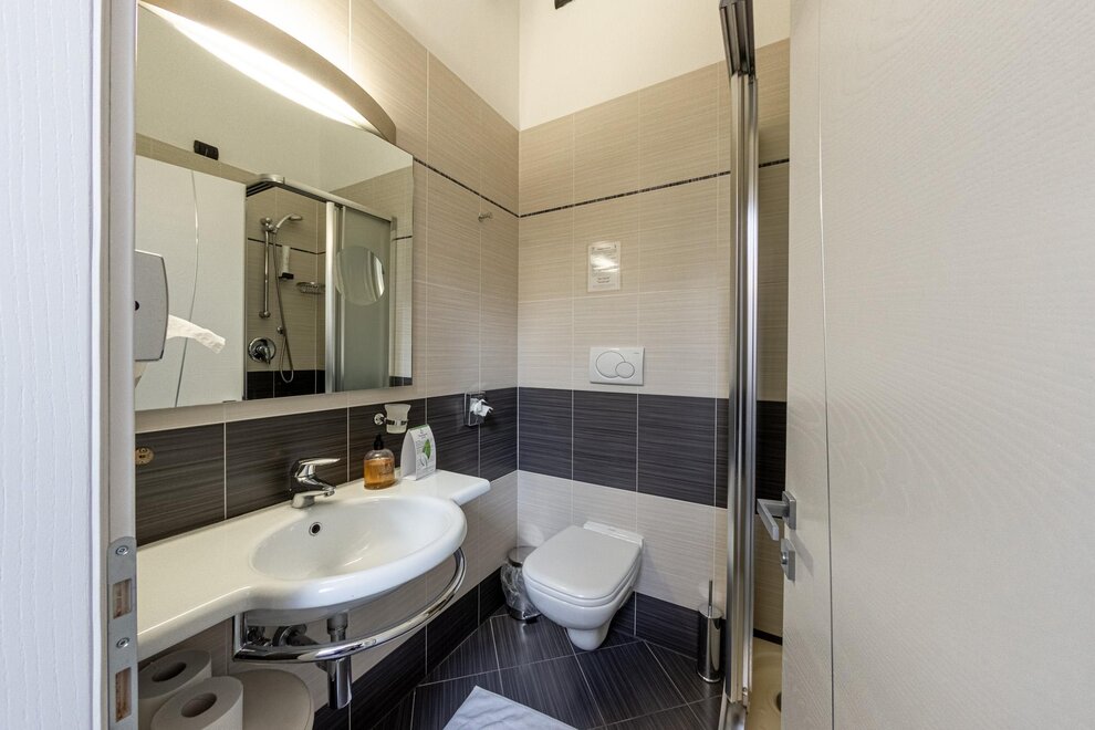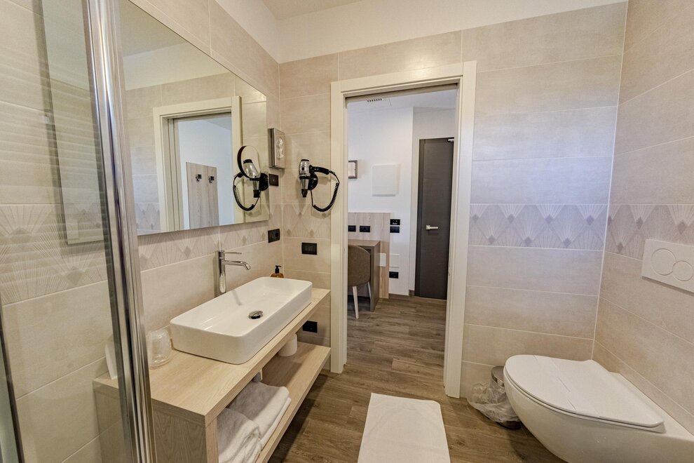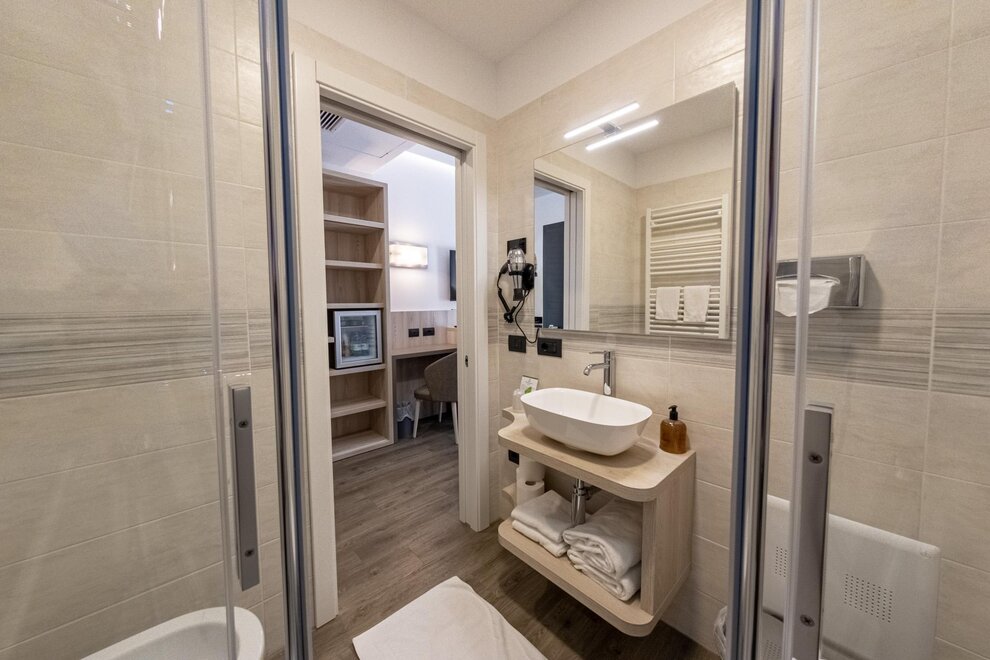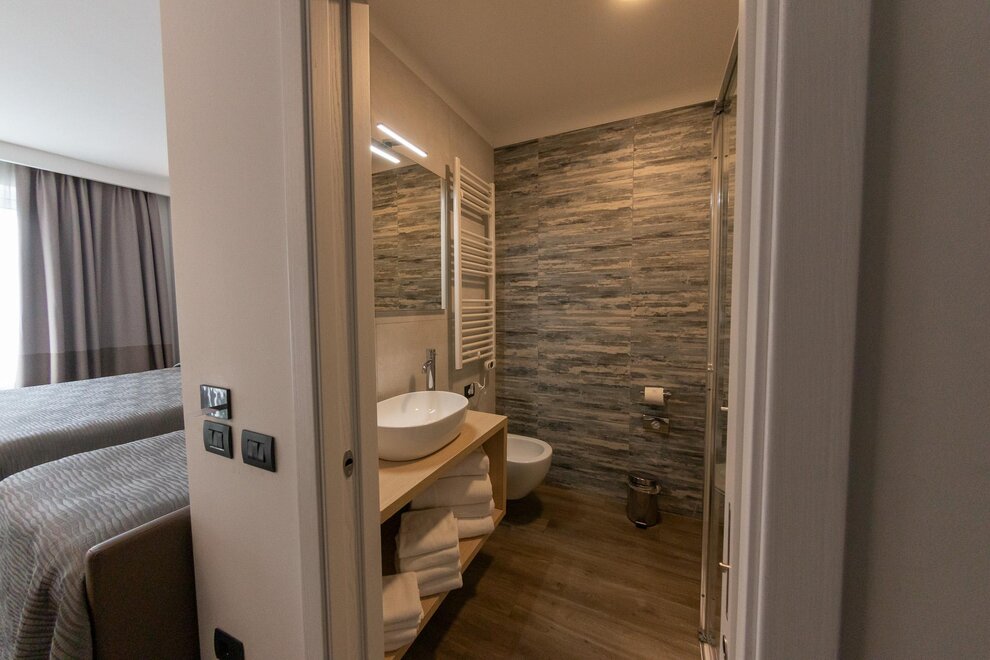 Il bagno privato, con set di cortesia incluso, offre la possibilità di scegliere tra una vasca o una doccia, per coccolarvi in ogni momento della giornata. Su richiesta, sono disponibili camere comunicanti, perfette per chi cerca un equilibrio tra privacy e convivialità.