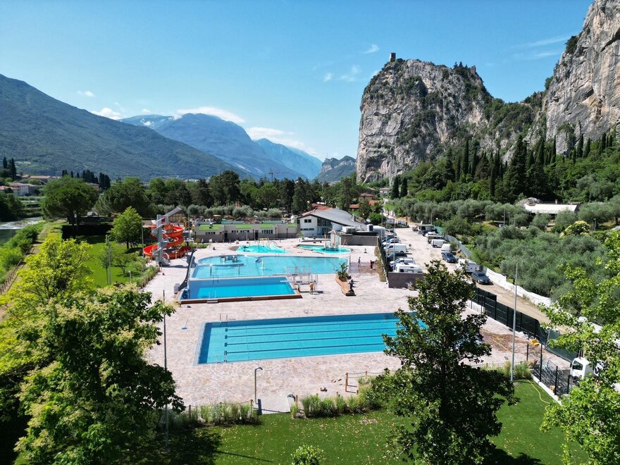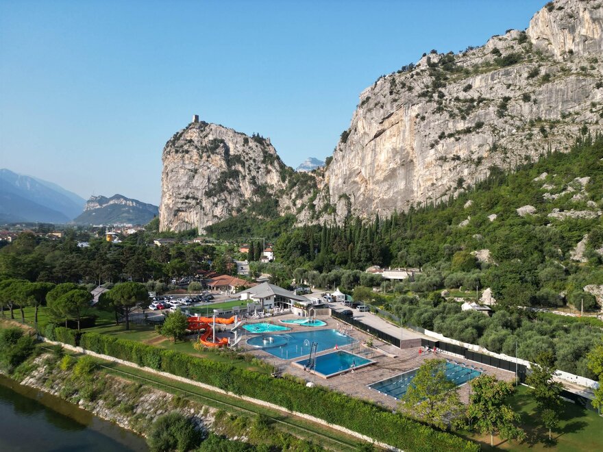 Il campeggio sorge sulle rive del fiume Sarca, ai piedi del Monte Colodri, a soli 5 km a nord del Lago di Garda, a 15 km dall'uscita dell'autostrada di Rovereto Sud, circa 40 km a sud di Trento e a 70 km da Verona.