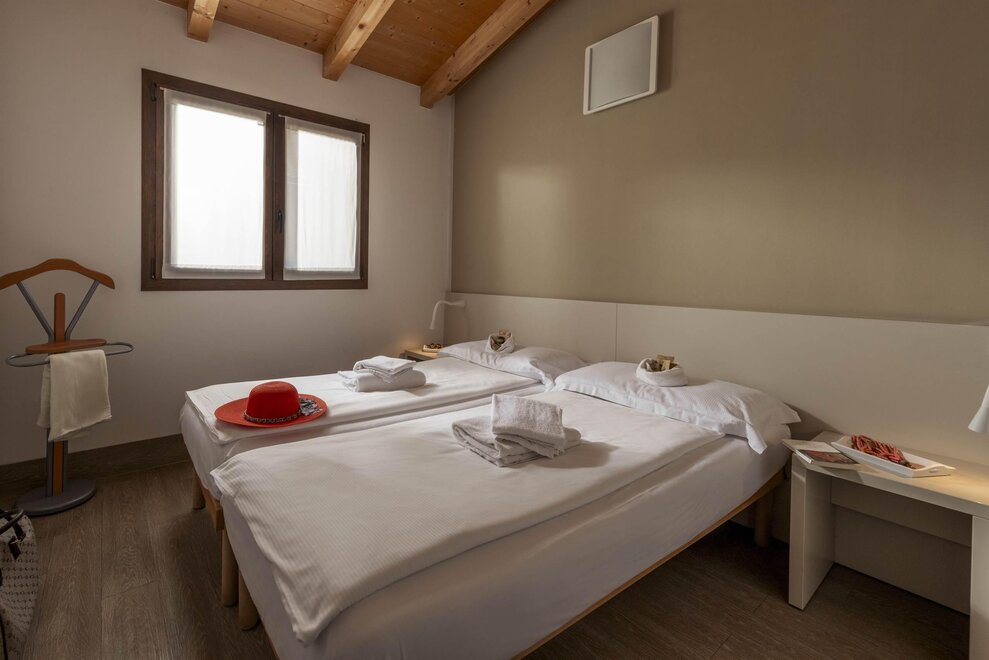 The “Prabi” mini apartments, in brick, are perfect for having all the comforts of home, allowing you an authentic camping experience. Surrounded by beautiful lush vegetation, the two-bedroom apartments with private bathroom can accomodate maximum four people and are equipped with safe, heating, bed linen, towels, blankets, television with satellite antenna and an equipped kitchenette (fridge, hob, microwave, crockery and kettle). They have a covered veranda with table and chairs to spend the days sitting outside with freinds and family and a private parking spot.