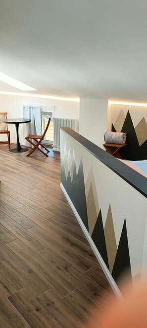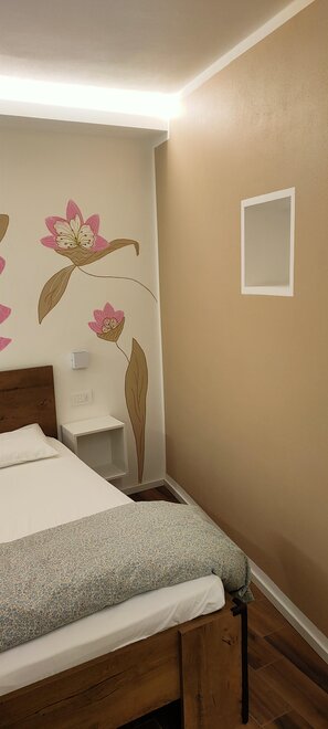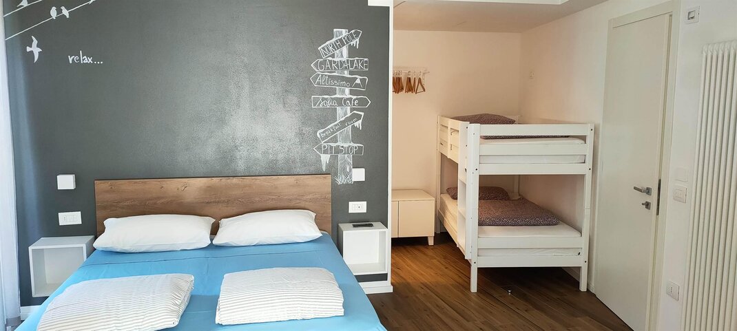 Camera quadrupla Deluxe di grandi dimensioni, composta da letto matrimoniale, letto a castello e bagno privato. La camera è completa di aria condizionata, riscaldamento, colazione servita nella hall dalla famiglia, televisore LCD,, cassaforte, bollitore con tisane e the, frigo bar, ampio balcone in legno, phone e lenzuola, piumoni e corredo bagno.