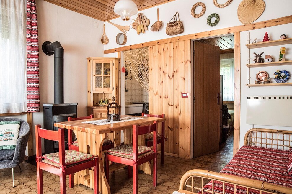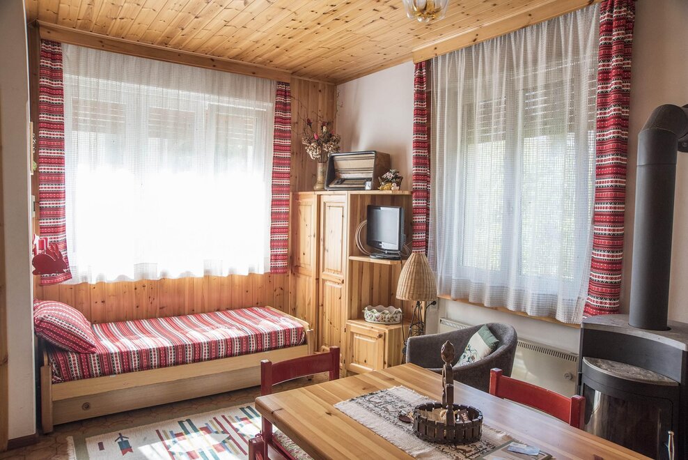 Offre ai suoi ospiti un arredo equilibrato: un mix di mobili tipicamente alpini in legno di pino con tessuti tipici della tradizione trentina ed elementi di recupero come la lampada e la poltrona di design, ed oggetti vintage trovati nei mercatini di antichità delle valli.