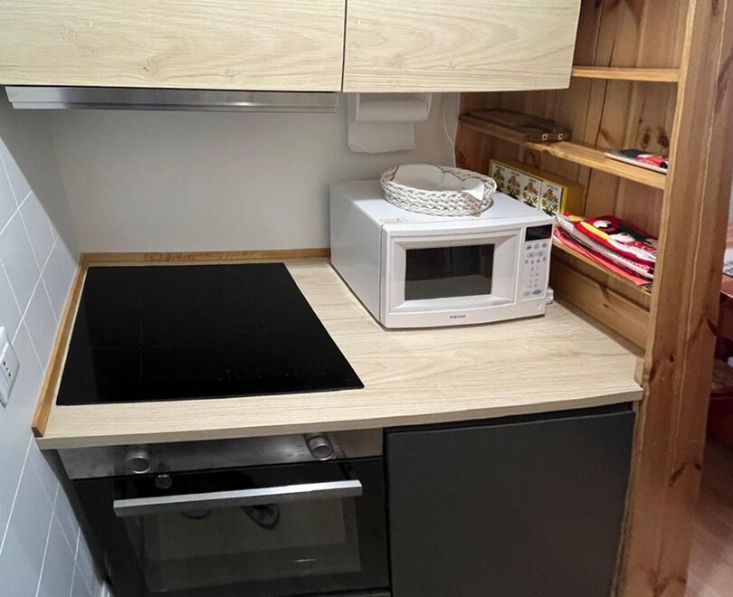 cucinino, piumone, frigorifero, microonde, armadio, TV, rilevatore di fumo, arredamento semplice, utensili da cucina, estintore, lavandino, biancheria tavola-cucina, rilevatore di monossido di carbonio, asciugacapelli, possibile cucinare, lavatrice, ferro da stiro, riscaldamento, stufa a legna