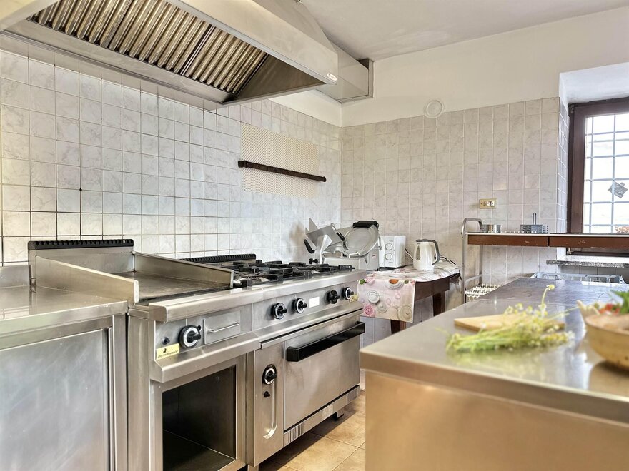 Cucina professionale, sala pranzo di 70 mq, 8 camere, 8 bagni, cantina, parcheggio esterno.