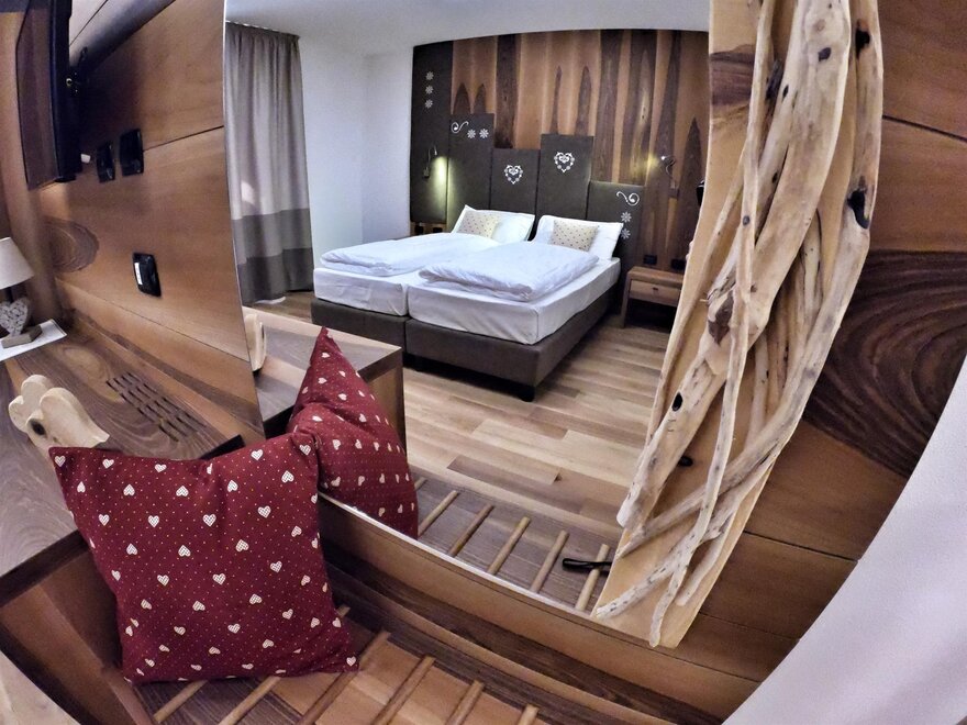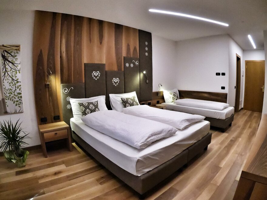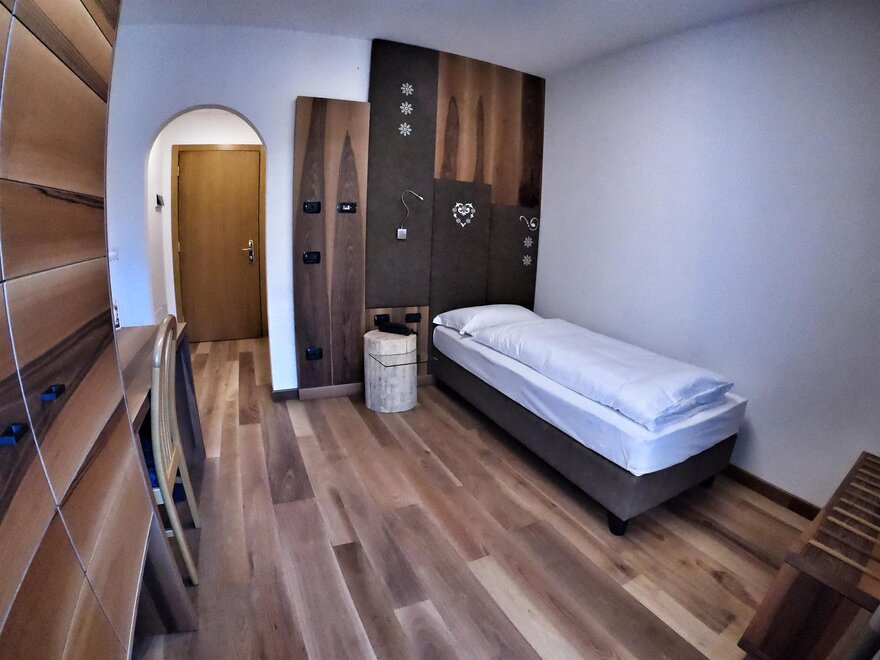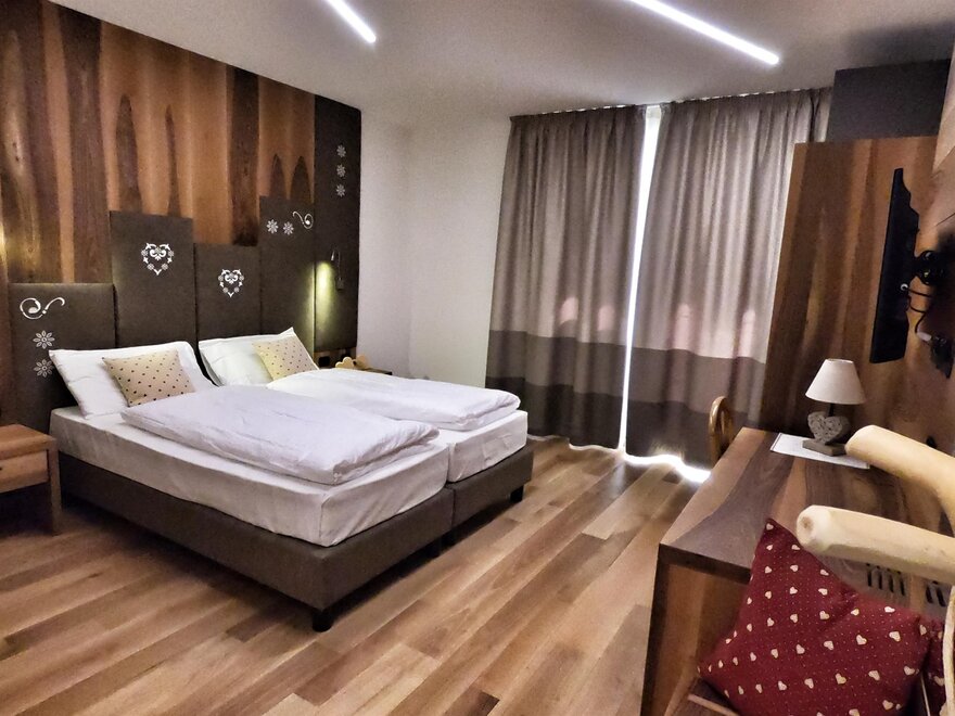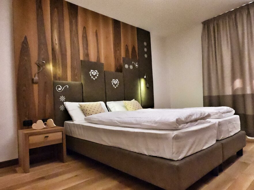 Le camere sono state tutte recentemente innovate. Ampie (20 mq circa) e confortevoli, le stanze da letto a vano unico, sono state completamente rinnovate e arredate con cura in classico stile alpino. Sono sobrie ed accoglienti, dotate inoltre di servizi ed attrezzature quali asciugacapelli in bagno, telefono con accesso diretto all'esterno, cassetta di sicurezza elettronica, televisore con collegamento SAT, serrature elettroniche, possibilità di connessione internet, quasi tutte provviste di balcone.