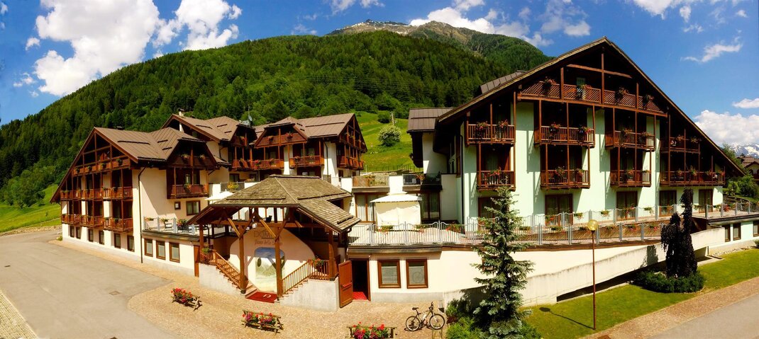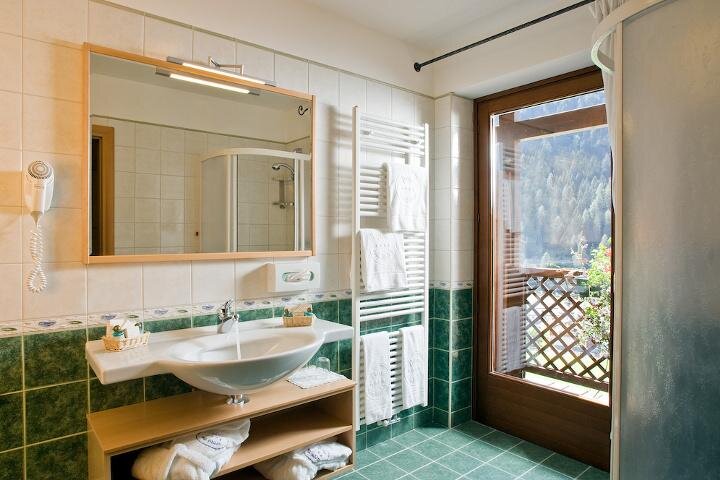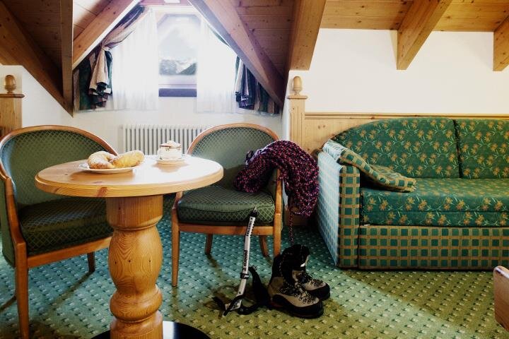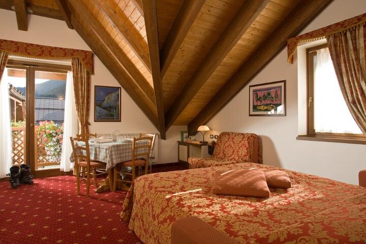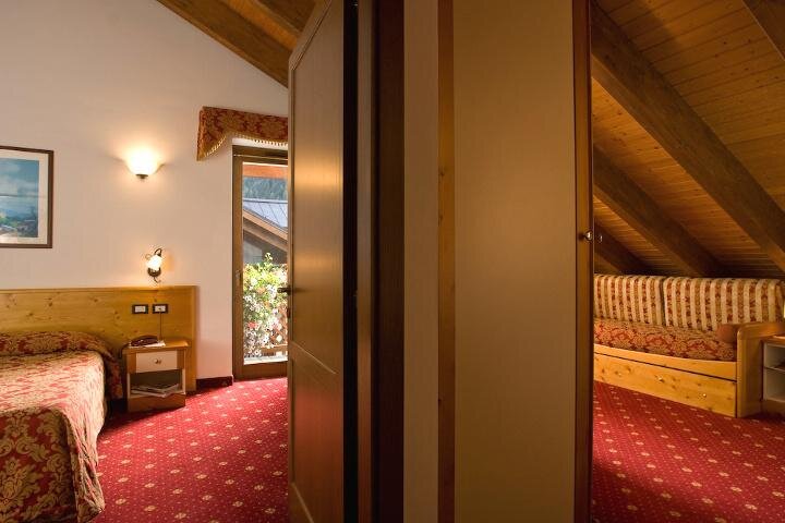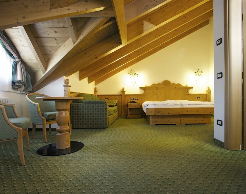 La Junior Suite è particolarmente confortevole, ampia e luminosa. Arredata in stile alpino, con cura per ogni dettaglio. L'uso sapiente del legno d'abete rosso la rende calda ed accogliente. La dotazione comprende: telefono, TV satellitare, frigobar, cassetta di sicurezza, collegamento internet Wi-Fi, balcone o terrazzo, servizi con doccia e asciugacapelli. INCLUSO NEL PREZZO L'INGRESSO AL CENTRO BENESSERE: piscina con attrazioni acquatiche,idromassaggi e vasta zona relax; sauna, bagno a vapore, vitarium, doccia attrazione.