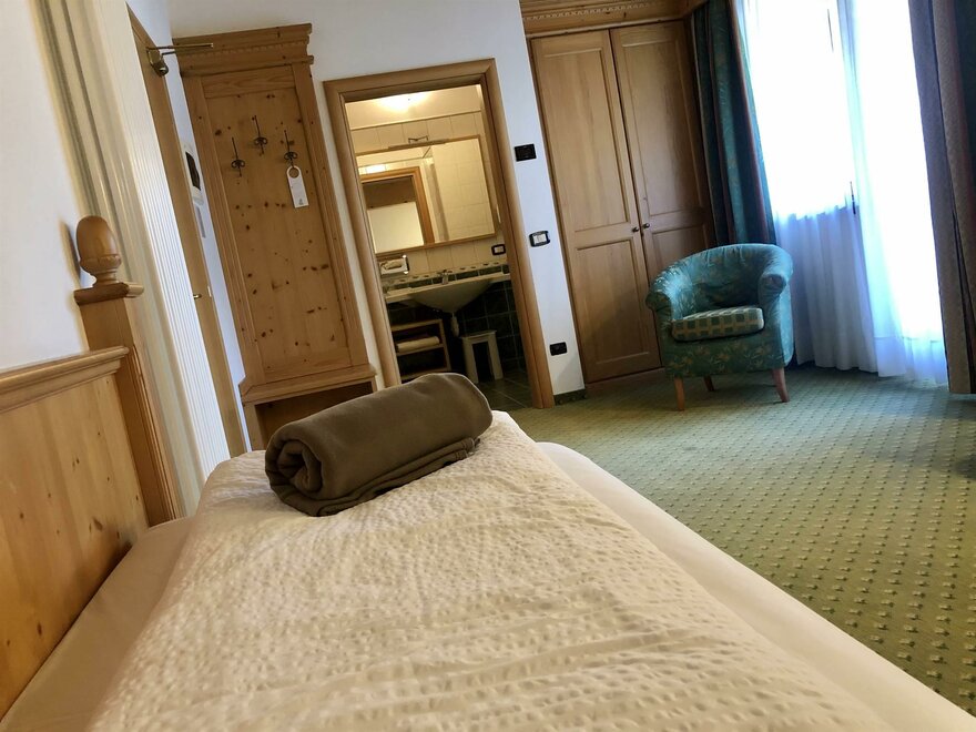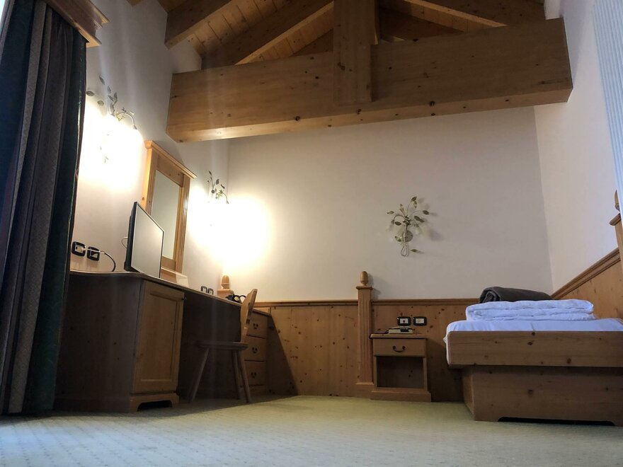 Per chi vuole trascorrere la vacanza in solitudine abbiamo a disposizione 2 spaziose camere singole arredate in stile alpino con comodo letto singolo, bagno privato e tutti i comfort.