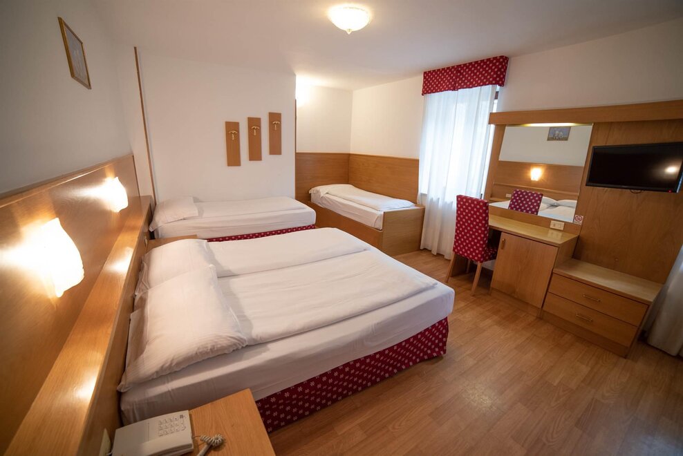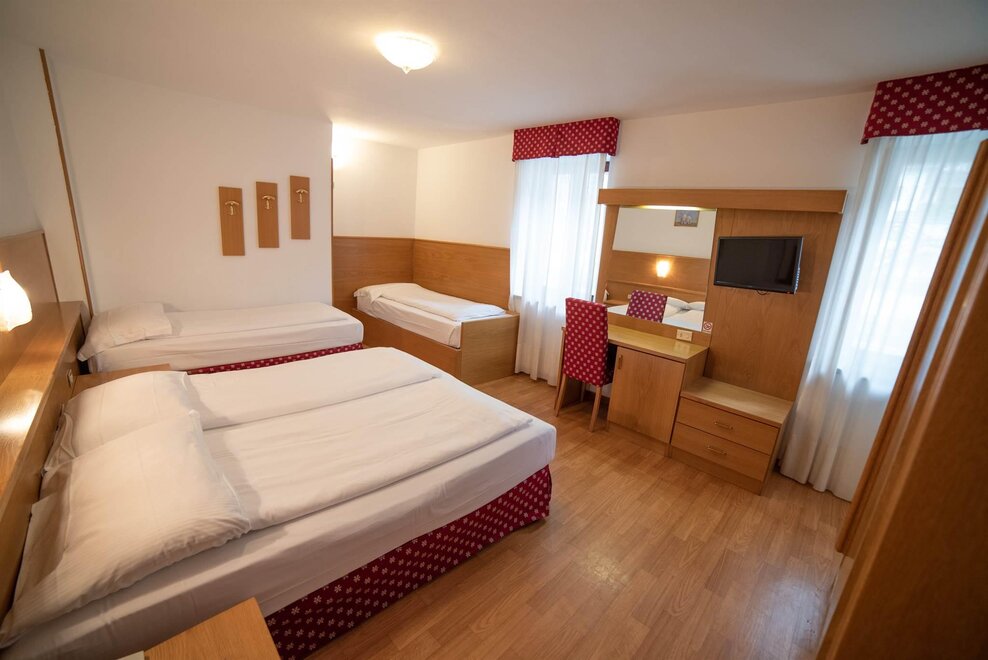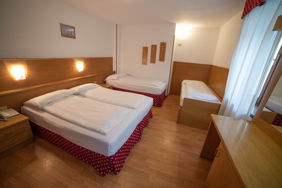 Stanza matrimoniale + 2 letti singoli con balcone, con arredamento in rovere e pavimentazione in legno. Vista paese e Forte Cherle.