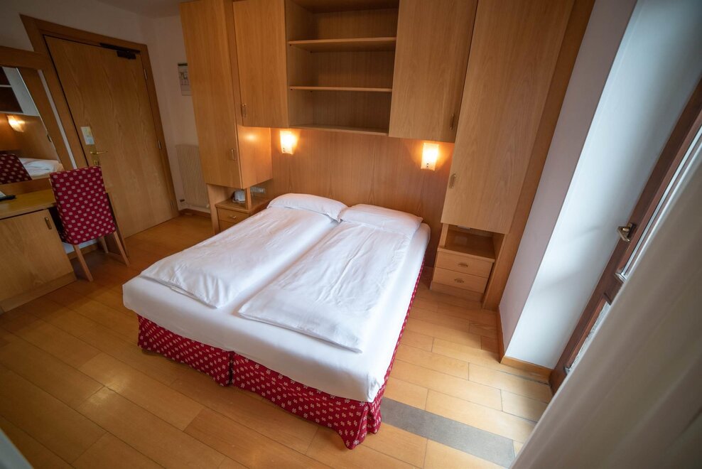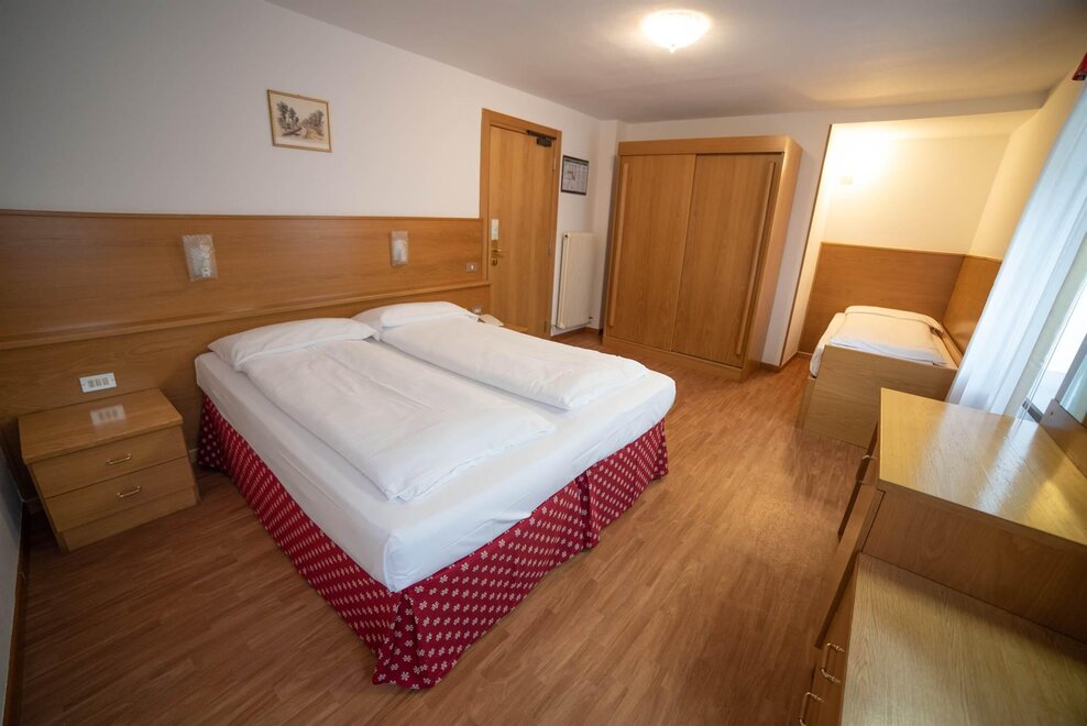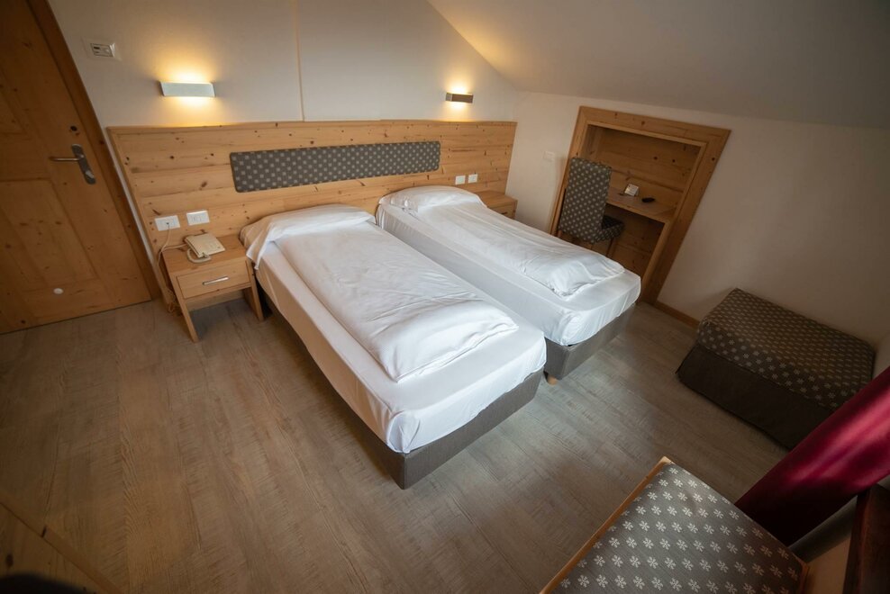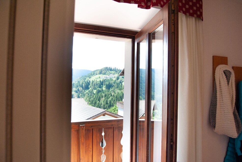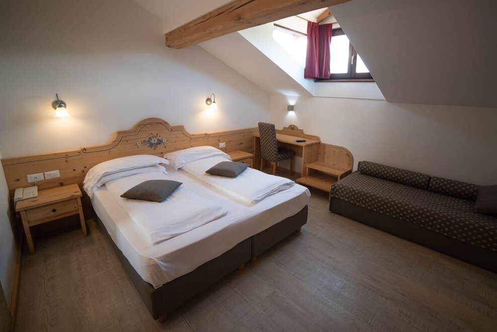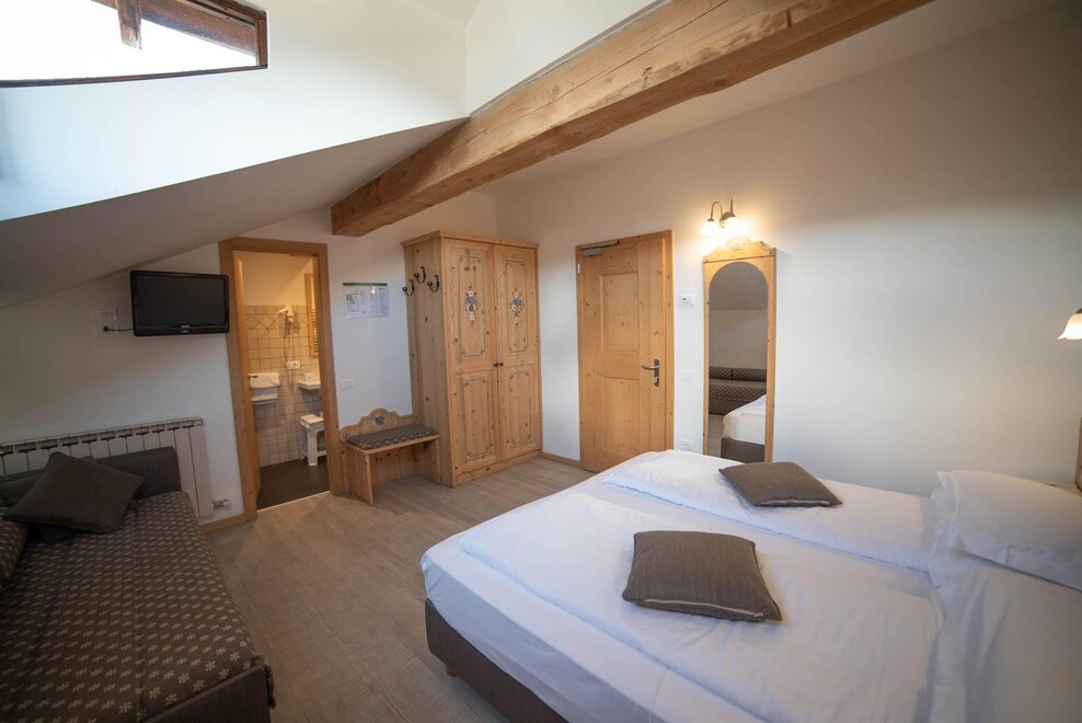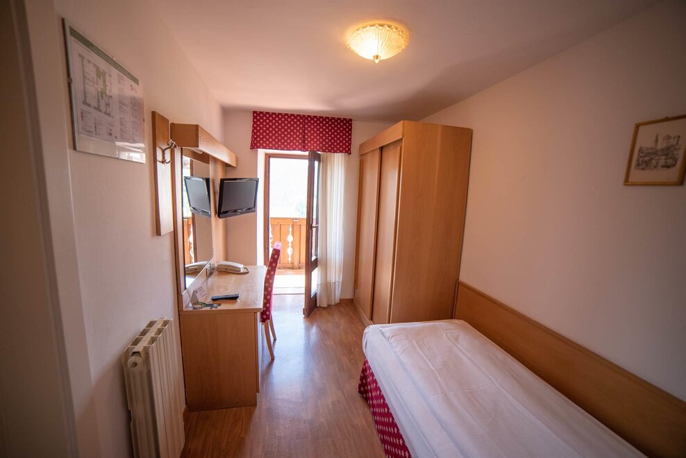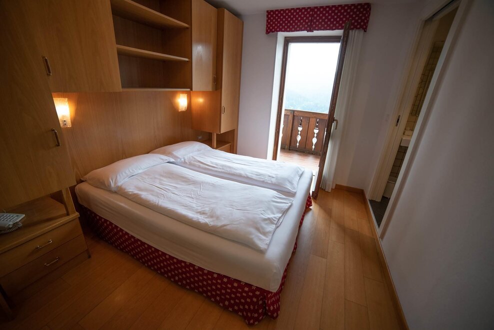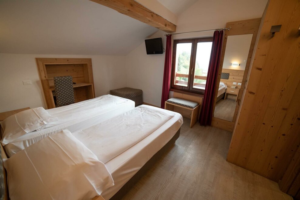 Stanza doppia con balcone, con arredamento in rovere/abete e pavimentazione in legno. Stanza dotata di balcone con vista sul paese.