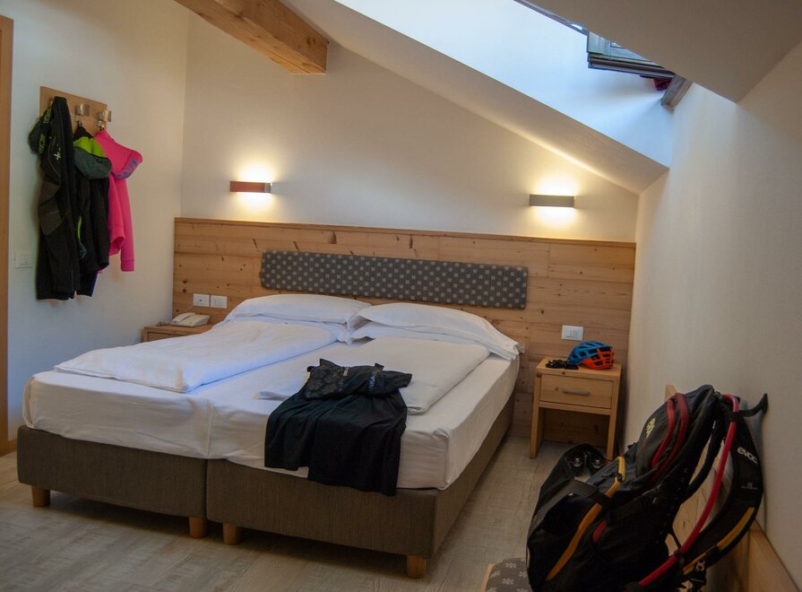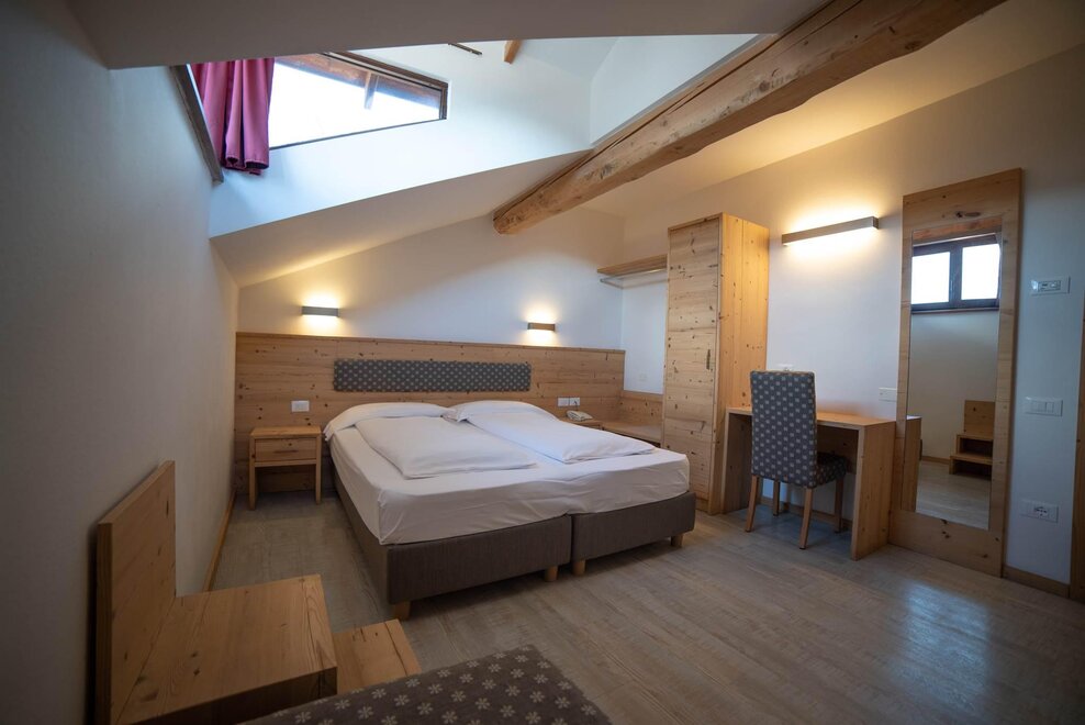Stanza matrimoniale mandarda, con arredamento in abete invecchiato e pavimentazione in legno.