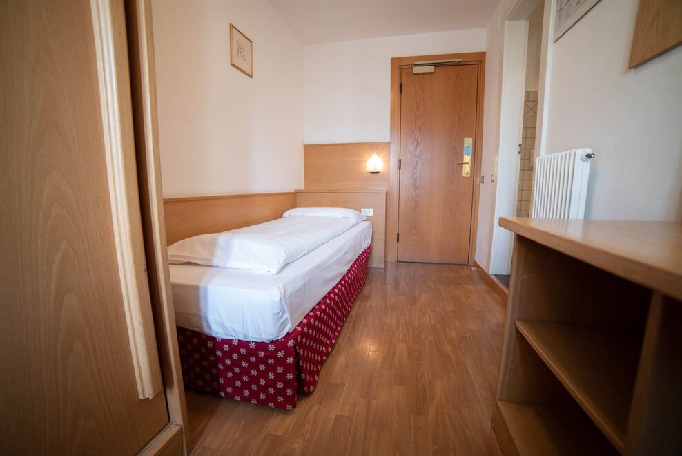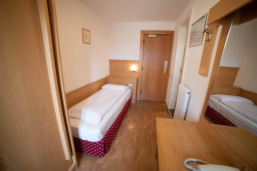Stanza singola con balcone, con arredamento in rovere e pavimentazione in legno.