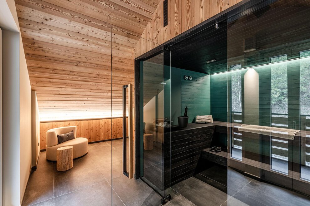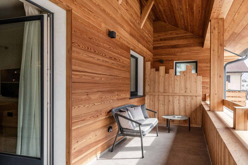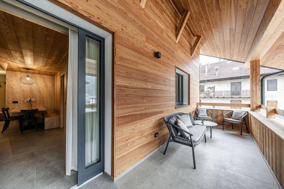 La Baita del Lat è un trilocale di 60 m² interamente rivestito in larice evaporato, un legno prezioso che dona calore, eleganza e un forte legame con la natura circostante.
