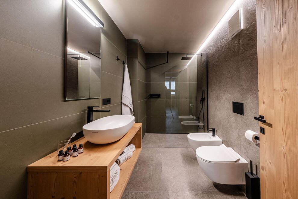 Pavimenti in vero rovere, bagno luxury con pavimentazione in porfido e pareti in terracotta restituiscono un’atmosfera elegante e autentica, perfetta per rigenerarsi.dotazioni camere/appartamenti