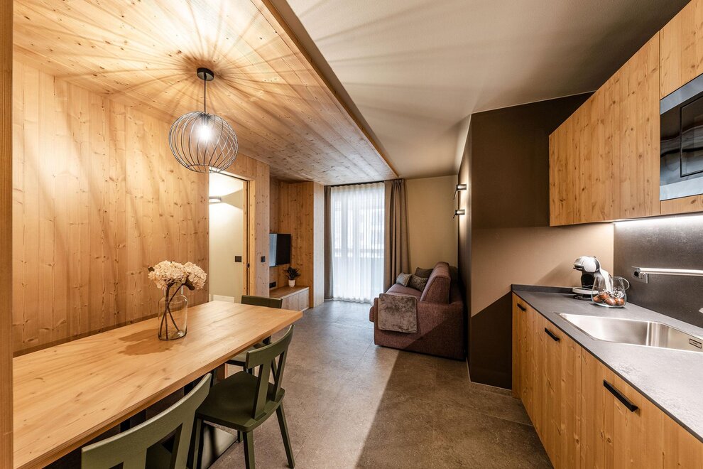 Il Mas de Coél è un bilocale mansardato dal fascino intimo e raccolto. Le travi a vista in larice, il balcone privato e la luce naturale che accarezza gli interni creano un’atmosfera da rifugio d’alta quota, perfetta per chi cerca quiete e autenticità.