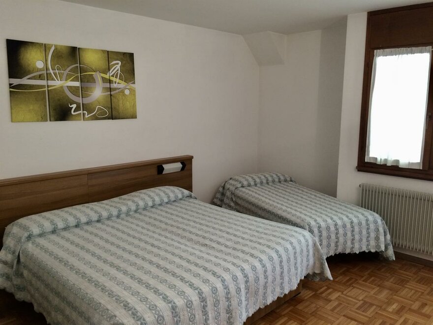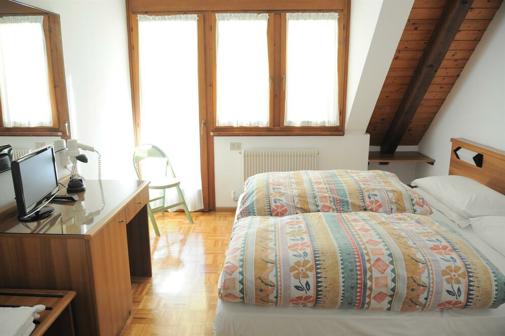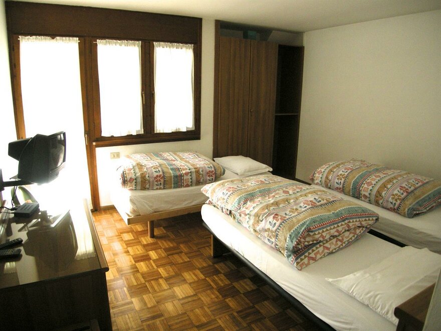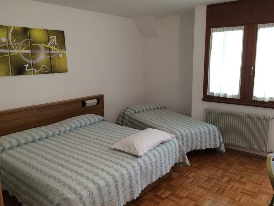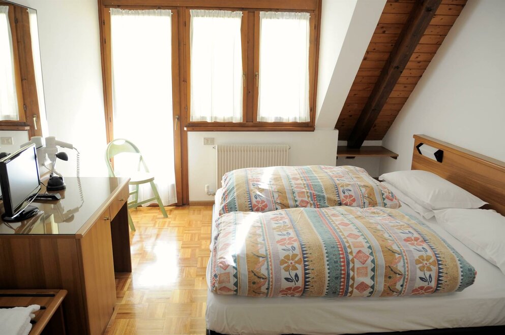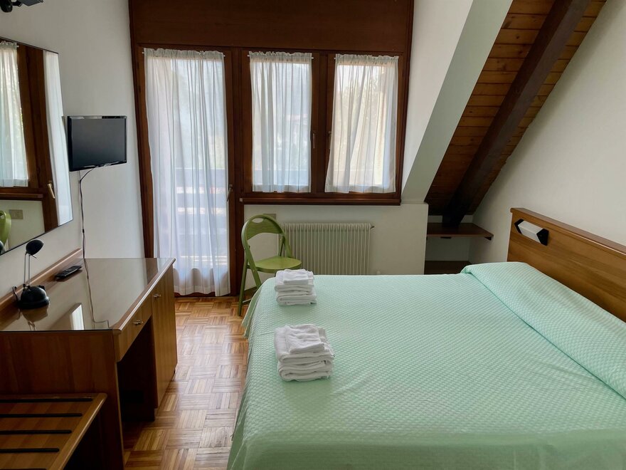 Camera con letto matrimoniale più letto singolo . Camera in stile alpino con pavimento in parquet , balconcino , servizi privati , asciugacapelli, TV , cassetta di sicurezza , Internet Wi-Fi