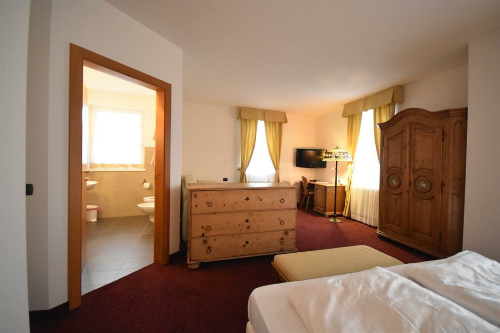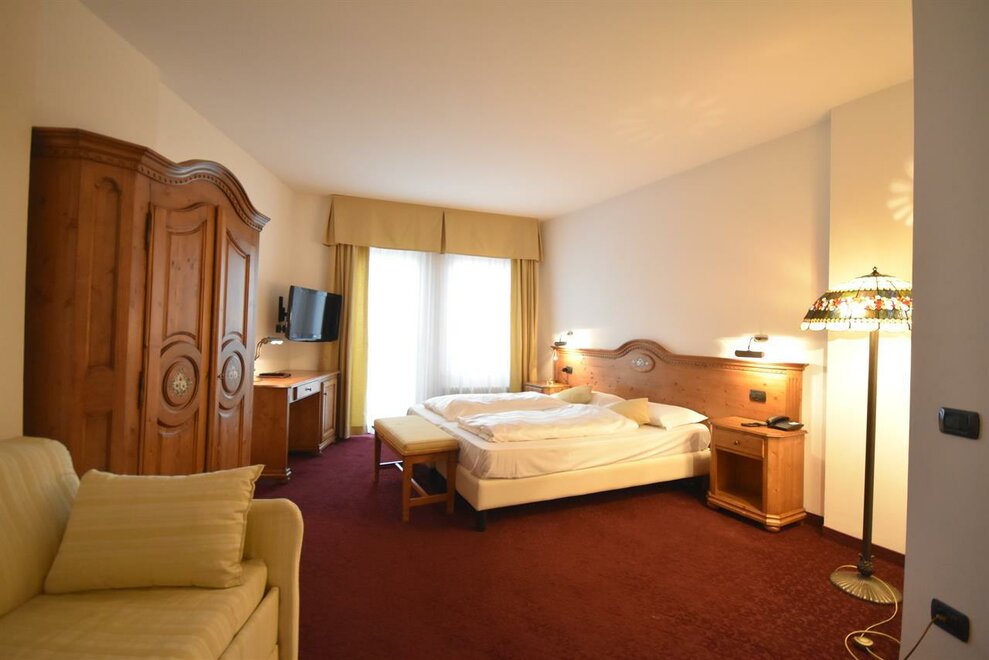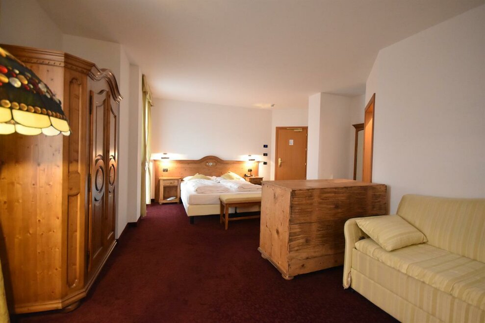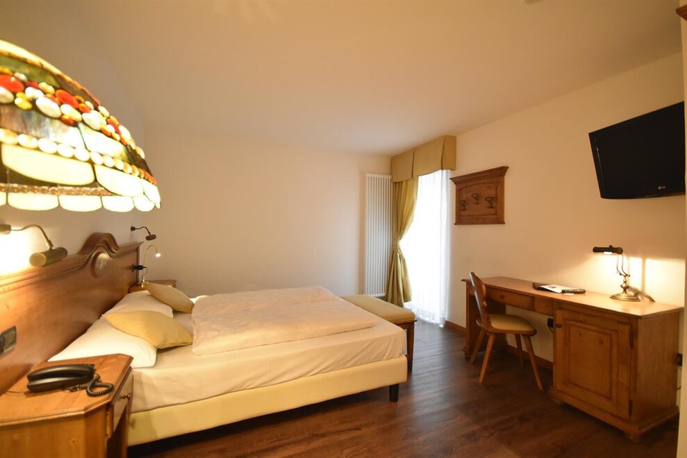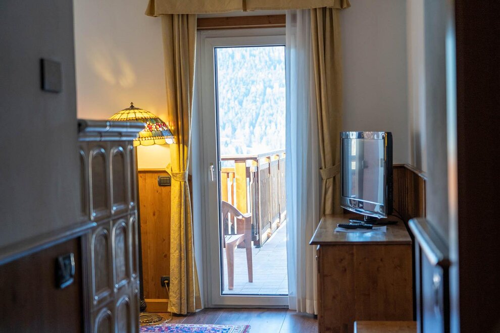 Camera ampia tra i 25 e i 30 mq con balcone, arredata in stile rustico e dotata di servizi privati con doccia, frigobar, telefono, cassaforte, courtesy set, accappatoio e ciabattine per uso wellness direttamente in stanza.