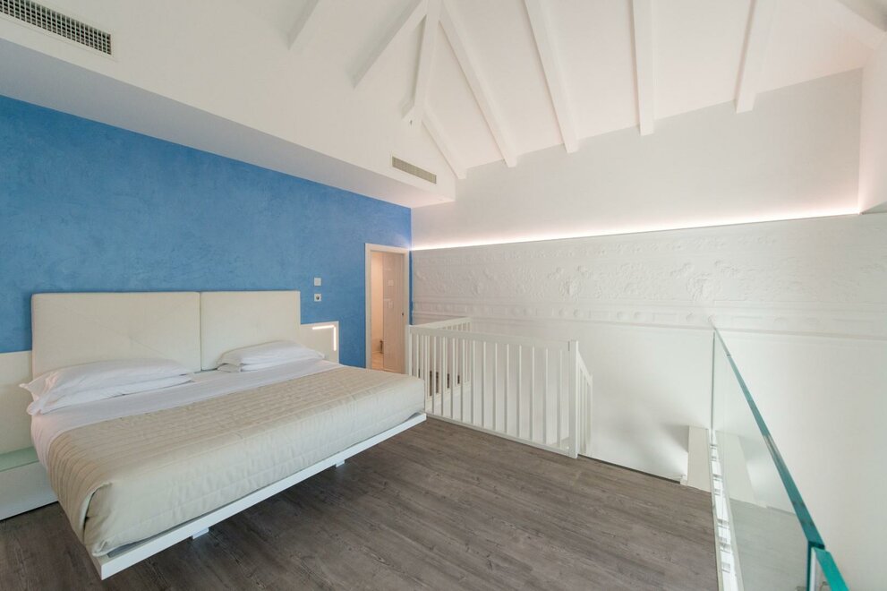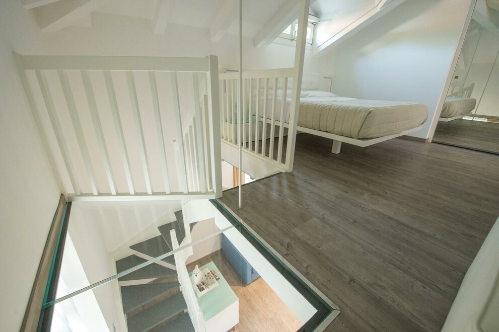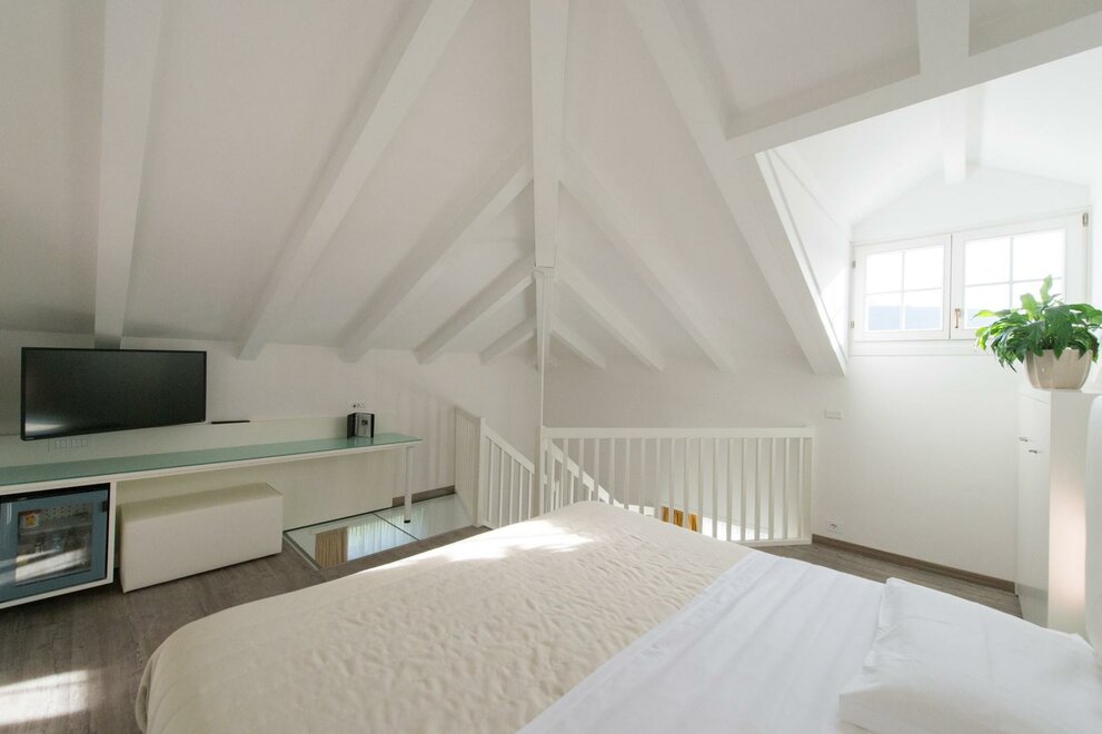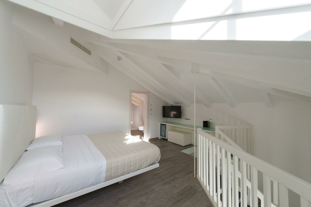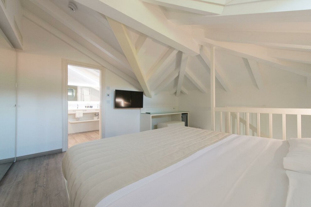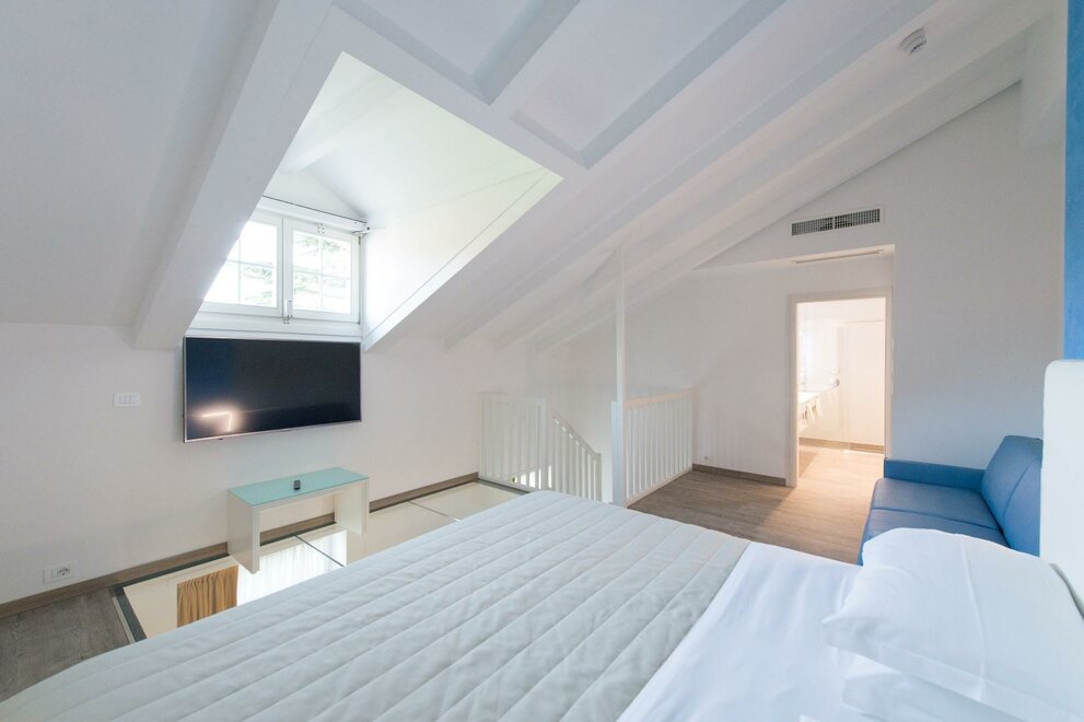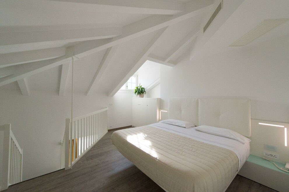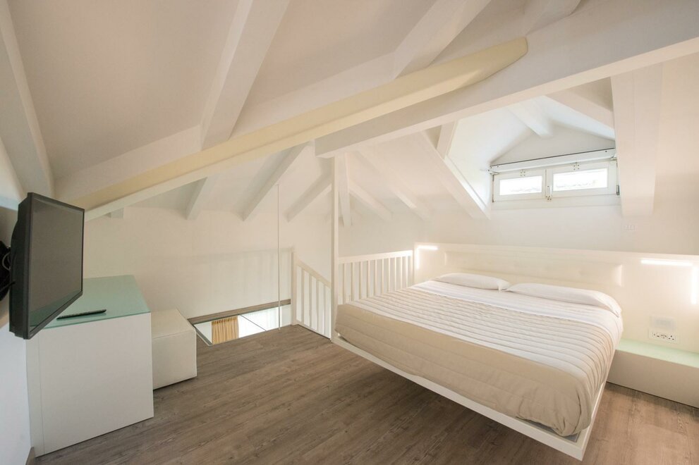 Al piano superiore mansardato (dotato di piccola finiestra posta al di sotto del tetto a spiovente) si trovano la stanza con letto matrimoniale, TV piatta, minibar ed il bagno dotato di doccia e doppi lavandini.